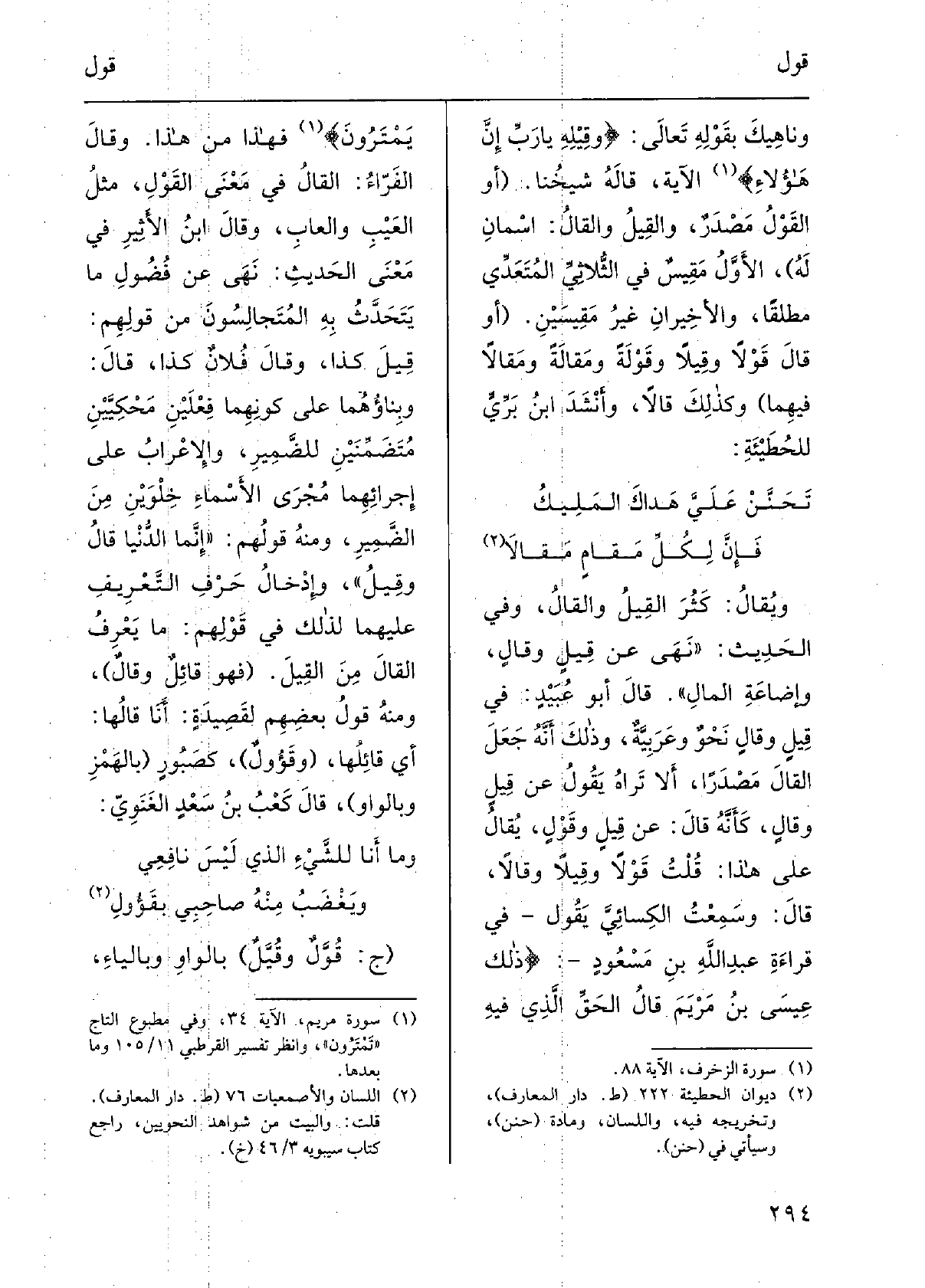 وناهِيكَ بقولِه تَعالى: {وقِيلِه يَا رَبِّ إنّ هؤلاءِ الْآيَة، قَالَه شيخُنا. أَو القَولُ مصدرٌ، والقِيلُ والقال: اسْمانِ لَهُ، الأوّلُ مَقِيسٌ فِي الثُّلاثيِّ المُتعدِّي مُطلقًا، والأخيرانِ غيرُ مَقيسَيْن. أَو قالَ} قَوْلاً {وقِيلاً} وقَوْلَةً {ومَقالَةً} ومَقالاً فيهمَا وَكَذَلِكَ {قَالَا، وأنشدَ ابنُ بَرِّيٍّ للحُطَيْئة:)