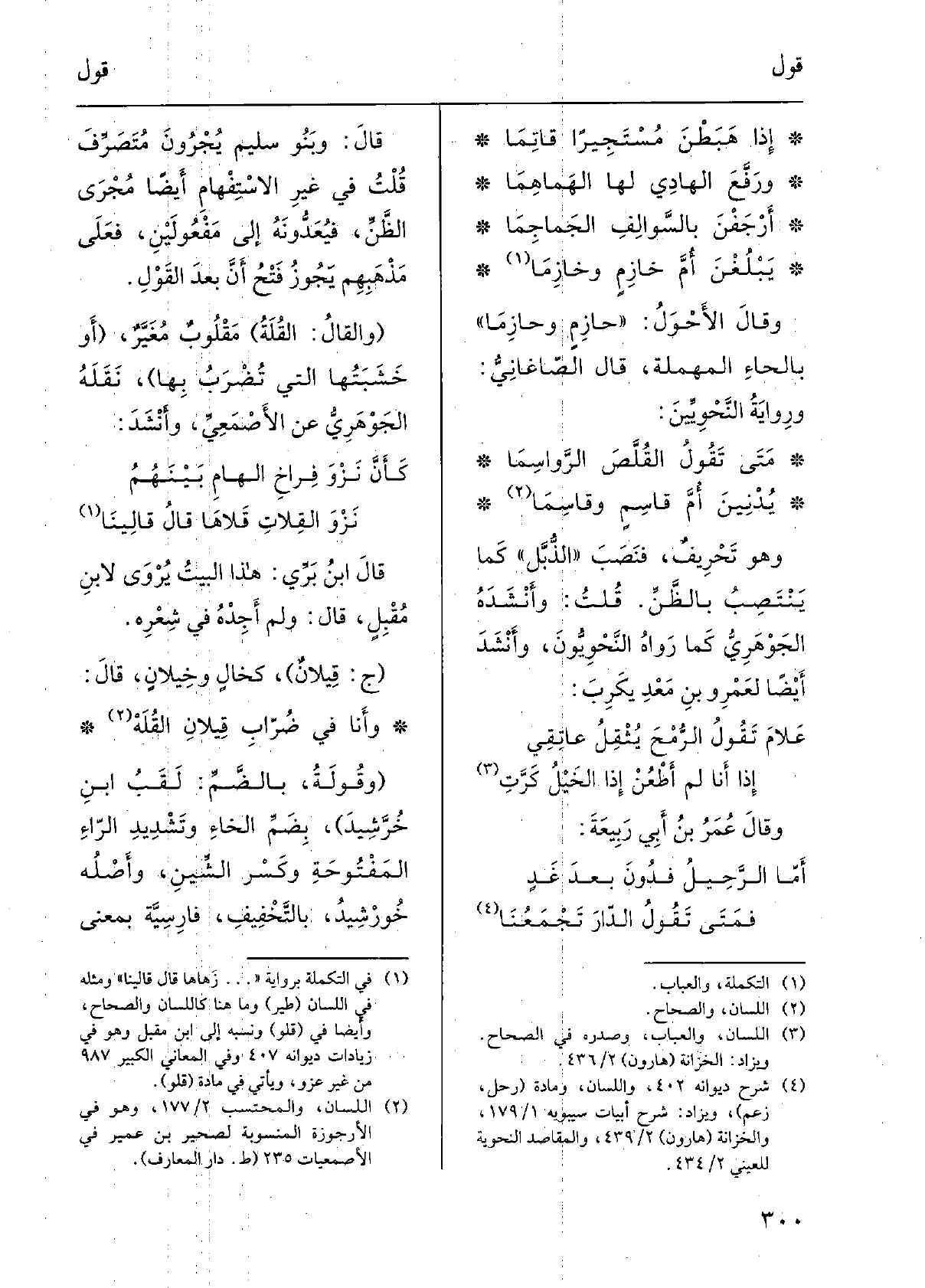 قَالَ: وبَنو سليم يُجْرونَ مُتَصَرِّفَ قُلْتُ فِي غيرِ الاستفهامِ أَيْضا مُجرى الظنِّ، فيُعَدُّونَه إِلَى مَفْعُولَيْن، فعلى مَذْهَبِهم يجوزُ فَتْحُ أنَّ بعدَ القَوْل. والقالُ: القُلَةُ مقلوبٌ مُغَيَّرٌ، أَو خَشَبَتُها الَّتِي تُضرَبُ بهَا، نَقَلَه الجَوْهَرِيّ عَن الأَصْمَعِيّ، وَأنْشد: