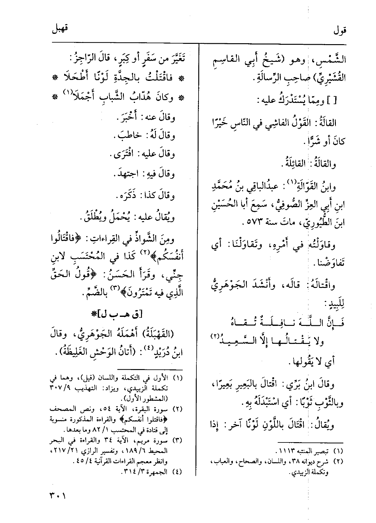 ويُقالُ عَلَيْهِ: يُحمَلُ ويُطلَق. وَمن الشَّواذِّ فِي القراءاتِ: {فاقْتالُوا أَنْفُسَكُم كَذَا فِي المُحْتَسَبِ لابنِ جِنِّي، وقرأَ الحسَنُ:} قُولُ الحَقِّ الَّذِي فِيهِ تَمْتَرون بالضَّمّ.