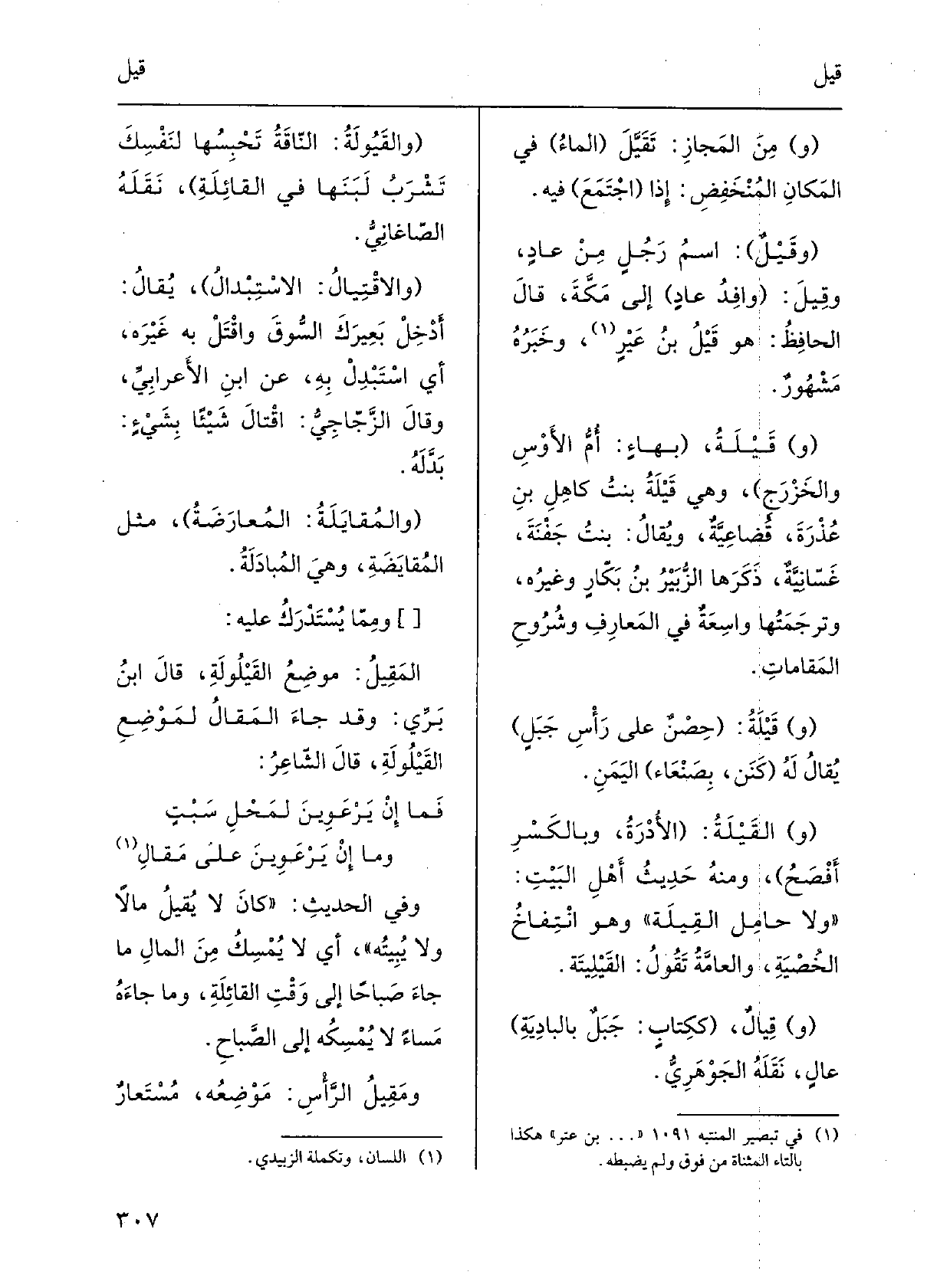 منَ المَجاز: تقَيَّلَ الماءُ فِي المكانِ المُنخفِض: إِذا اجتمعَ فِيهِ. {وَقَيْلٌ: اسمُ رجلٍ من عادٍ، وَقيل: وافِدُ عادٍ إِلَى مكّةَ، قَالَ الحافظُ: هُوَ} قَيْلُ بنُ عَيْرٍ، وخبَرُه مَشْهُورٌ. (و) {قَيْلَةُ، بهاءٍ: أمُّ الأَوْسِ والخَزرَج، وَهِي قَيْلَةُ بنتُ كاهلِ بن عُذْرَةَ، قُضاعِيّةٌ، وَيُقَال: بنتُ جَفْنَةَ، غَسّانِيّةٌ، ذَكَرَها الزُّبَيْرُ بنُ بَكّارٍ وغيرُه، وترجمَتُها واسعةٌ فِي المَعارفِ وشُروحِ المَقامات. قَيْلَةُ: حِصنٌ على رأسِ جبَلٍ يُقَال لَهُ كَنَن، بصنعاءِ الْيمن. (و) } القَيْلَة: الأُدْرَةُ، وبالكَسْر أَفْصَحُ، وَمِنْه حديثُ أهلِ البيتِ: وَلَا حامِلُ {القِيلَة وَهُوَ انتِفاخُ الخُصْيَةِ، والعامّةُ تقولُ:} القَيْلِيتَة. (و) {قِيالٌ، ككِتابٍ: جبَلٌ بالباديةِ عالٍ، نَقله الجَوْهَرِيّ.} والقَيُولَة: الناقةُ تَحْبِسُها لنَفسِكَ تشربُ لَبَنَها فِي القائلَةِ، نَقله الصَّاغانِيّ. {والاقْتِيالُ: الاستِبدالُ، يُقَال: أَدْخِلْ بَعيرَكَ السُّوقَ} واقْتَلْ بِهِ غَيْرَه، أَي استَبْدِلْ بِهِ، عَن ابْن الأَعْرابِيّ، وَقَالَ الزَّجَّاجيُّ: {اقْتالَ شَيْئا بشيءٍ: بدَّلَه.} والمُقايَلة: المُعارَضة، مثل المُقايَضة، وَهِي المُبادَلة. ومِمّا يُسْتَدْرَك عَلَيْهِ: {المَقيل: مَوْضِعُ} القَيْلولَة، قَالَ ابنُ بَرِّي: وَقد جاءَ المَقالُ لمَوضِعِ القَيْلولَةِ، قَالَ الشَّاعِر: