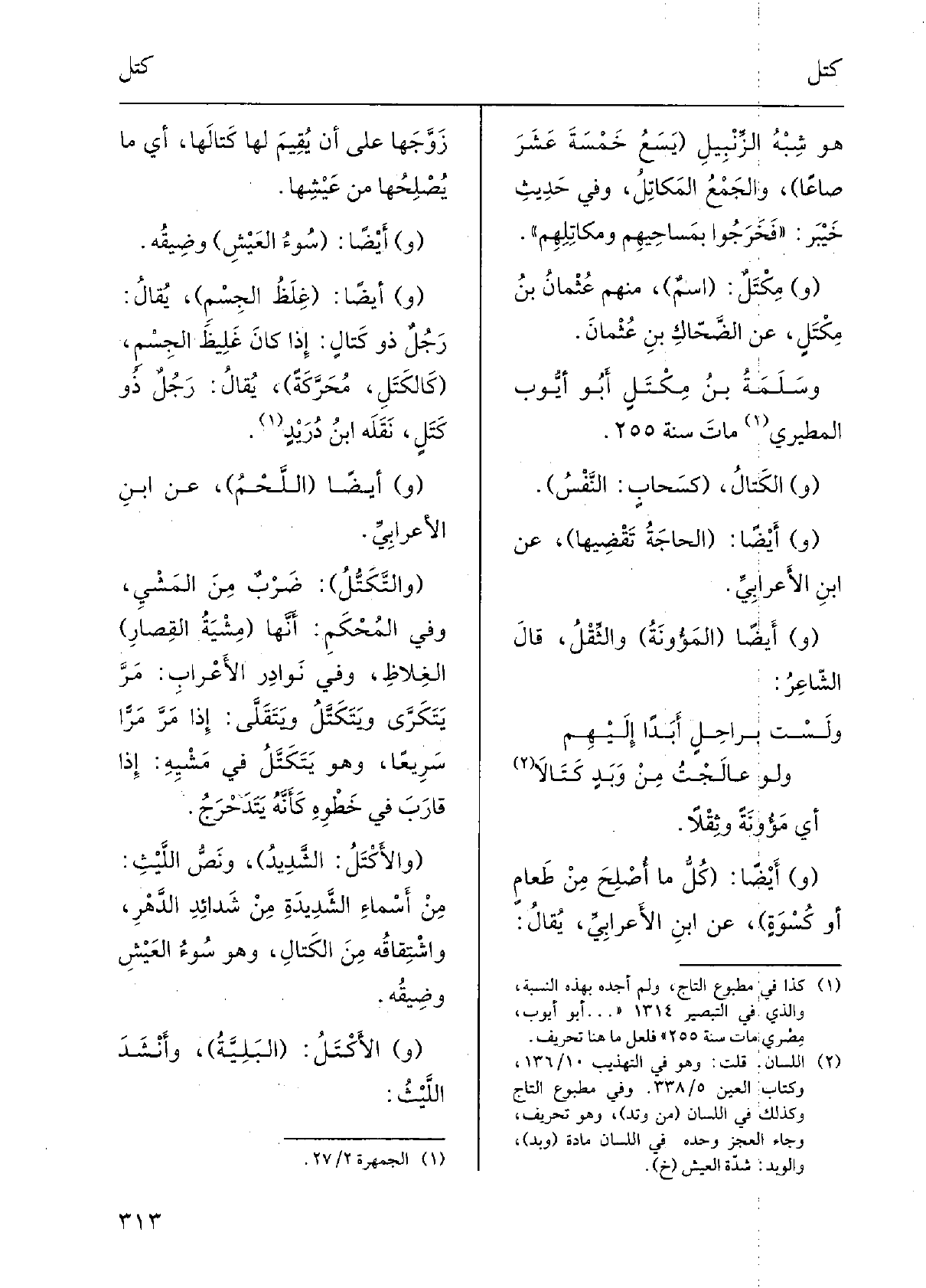 هُوَ شِبهُ الزِّنْبيلِ يَسَعُ خَمْسَةَ عَشَرَ صَاعا، والجمعُ المَكاتِل، وَفِي حديثِ خَيْبَر: فَخَرَجوا بمَساحِيهِم ومكاتِلِهم. مِكْتَلٌ: اسمٌ، مِنْهُم عثمانُ بنُ مِكْتَلٍ، عَن الضَّحَّاكِ بنِ عُثْمَان. وَسَلَمةُ بنُ مِكْتَلٍ أَبُو أيُّوبَ المطيري مَاتَ سنة. الكَتال، كسَحابٍ: النَّفْسُ. أَيْضا: الحاجةُ تَقْضِيها، عَن ابْن الأَعْرابِيّ. أَيْضا: المَؤونَةُ والثِّقْلُ، قَالَ الشَّاعِر: