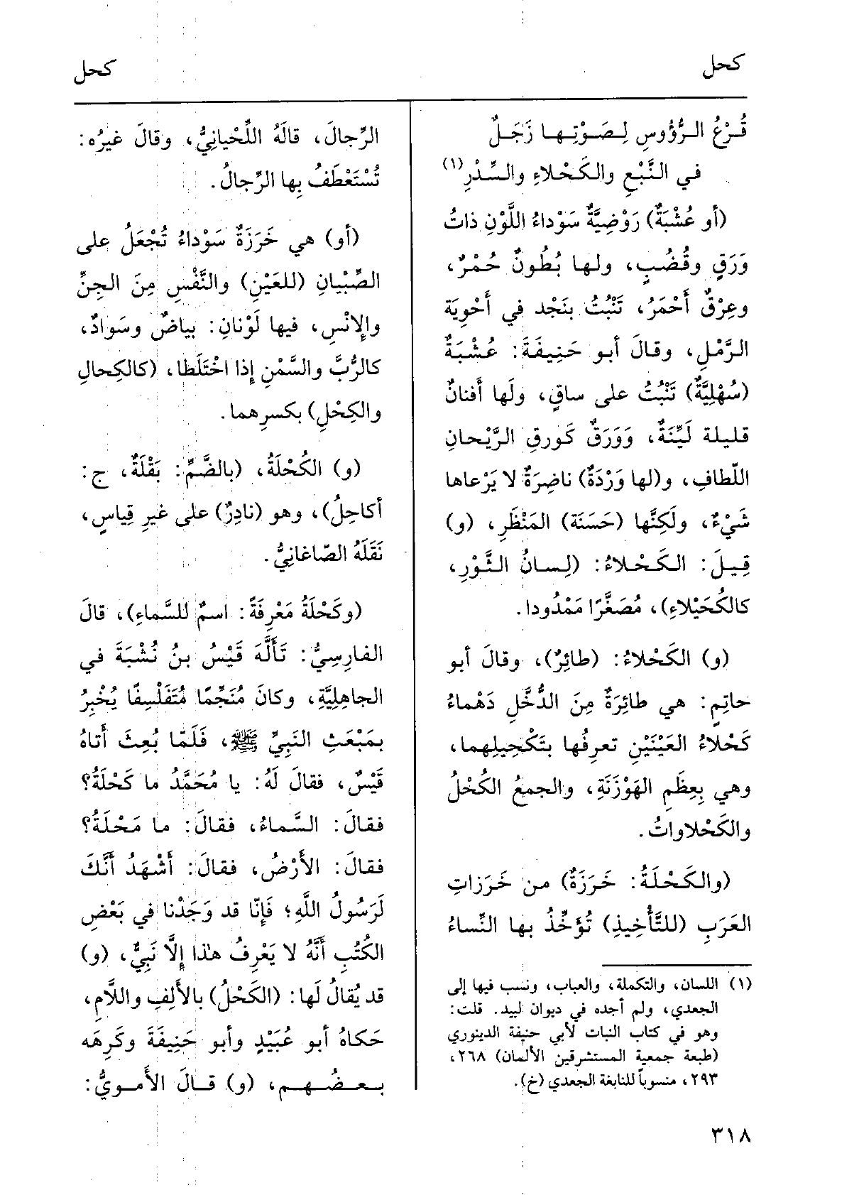 أَو عُشبةٌ رَوْضِيّةٌ سَوْدَاءُ اللونِ ذاتُ ورَقٍ وقُضُبٍ، وَلها بُطونٌ حُمْرٌ، وعِرقٌ أَحْمَرُ، تَنْبُتُ بنَجْد فِي أَحْوِيَةِ الرملِ، وَقَالَ أَبُو حنيفَة: عُشبةٌ سُهْلِيَّةٌ تَنْبُتُ على ساقٍ، وَلها أَفْنَانٌ قَليلَة ليِّنَةٌ، وَوَرَقٌ) كَوَرَقِ الرَّيْحانِ اللّطاف، وَلها وَرْدَةٌ ناضِرَةٌ لَا يَرْعَاها شيءٌ، ولكنّها حَسَنَة المَنظر، قيل: الكَحْلاء: لِسانُ الثَّورِ، كالكُحَيْلاء، مُصغَّراً مُشدَّداً. الكَحْلاء: طائرٌ، وَقَالَ أَبُو حاتمٍ: هِيَ طائرةٌ من الدُّخَّلِ دَهْمَاءُ كَحْلاءُ العَينَيْنِ تَعْرِفُها بتَكْحيلِهما، وَهِي بعِظَمِ الهَوْزَنَةِ، والجمعُ الكُحْلُ والكَحْلاوات. والكَحْلَة: خَرَزَةٌ من خَرَزَاتِ العربِ للتأخيذِ تُؤَخَّذُ بهَا النساءُ الرجالَ، قَالَه اللِّحْيانِيّ، وَقَالَ غيرُه: تُسْتَعْطَفُ بهَا الرِّجالُ. أَو هِيَ خَرَزَةٌ سَوْدَاءُ تُجعَلُ على الصِّبيانِ للعَينِ والنَّفسِ من الجِنِّ والإنسِ، فِيهَا لَوْنَان: بياضٌ وسوادٌ، كالرُّبَّ والسَّمْنِ إِذا اخْتَلَطا، كالكِحالِ والكِحْلِ بكسرِهما. الكُحْلَة، بالضَّمّ: بَقْلَةٌ، ج: أكاحِلٌ، وَهُوَ نادرٌ على غيرِ قِيَاس، نَقله الصَّاغانِيّ. وَكَحْلَةُ مَعْرِفةٍ: اسمٌ للسماءِ، قَالَ الفارسيُّ: تألَّه قَيْسُ بنُ نُشْبَةَ فِي الجاهليّةِ، وَكَانَ مُنَجِّماً مُتَفَلْسِفاً يُخبرُ بمَبْعَثِ النبيِّ صلّى الله عَلَيْهِ وسلَّم، فلمّا بُعِثَ أَتَاهُ قَيسٌ، فَقَالَ لَهُ: يَا مُحَمَّد مَا كَحْلَةُ فَقَالَ: السماءُ، فَقَالَ: مَا مَحْلَةُ فَقَالَ: الأَرْض، فَقَالَ: أَشْهَدُ أنّكَ لرسولُ الله فإنّا قد وَجَدْنا فِي بعضِ الكتُبِ أنّه لَا يعرفُ هَذَا إلاّ نبيٌّ، قد يُقَال لَهَا: الكَحْلُ بالألِفِ واللامِ، حَكَاهُ أَبُو عُبَيْدٍ وَأَبُو حنيفةَ وكَرِهَه بعضُهم، قَالَ الأُمَوِيُّ: