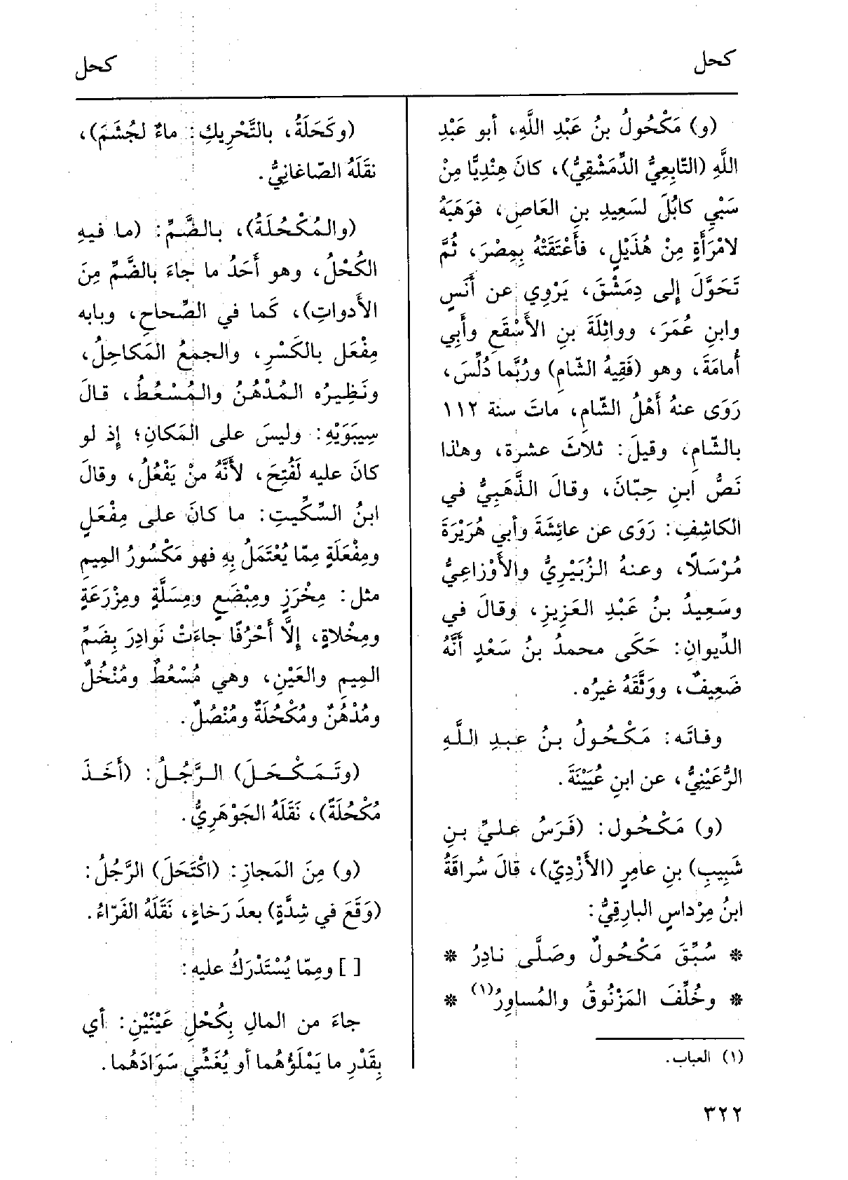 وفاتَه: مَكْحُولُ بنُ عَبْد الله الرُّعَيْنيُّ، عَن ابنِ عُيَيْنةَ. مَكْحُول: فرَسُ عليِّ بن شَبيبِ بن عامرٍ الأزْديِّ، قَالَ سُراقَةُ بنٌ مِرْداسٍ البارِقيُّ: سُبِّقَ مَكْحُولٌ وصلَّى نادِرُ وخُلِّفَ المَزْنوقُ والمُساوِرُ وَكَحَلةُ، بِالتَّحْرِيكِ: ماءٌ لجُشَمَ، نَقله الصَّاغانِيّ. والمُكْحُلَة، بالضَّمّ: مَا فِيهِ الكُحْلُ، وَهُوَ أحدُ مَا جاءَ بالضَّمّ من الأدوات، كَمَا فِي الصِّحاح، وبابه مِفْعَل بالكَسْر، والجمعُ المَكاحِل، ونَظيرُه المُدْهُنُ والمُسْعُطُ، قَالَ سِيبَوَيْهٍ: وَلَيْسَ على المكانِ إِذْ لَو كَانَ عَلَيْهِ لفُتِح، لأنّه من يَفْعُلُ، وَقَالَ ابْن السِّكِّيت: مَا كَانَ على مِفْعَلٍ ومِفْعَلَةٍ ممّا يُعْتَمَلُ بِهِ فَهُوَ مَكْسُورُ الميمِ مثل: مِخْرَزٍ ومِبْضَعٍ ومِسَلَّةٍ ومِزْرَعةٍ ومِخْلاةٍ، إلاّ أَحْرُفاً جاءَتْ نوادِرَ بضمِّ الميمِ والعَينِ، وَهِي مُسْعُطٌ ومُنْخُلٌ ومُدْهُنٌ ومُكْحُلَةٌ ومُنْصُلٌ. وَتَمَكْحَلَ الرجلُ: أَخَذَ مُكْحُلَةً، نَقله الجَوْهَرِيّ. منَ المَجاز: اكْتَحلَ الرجلُ: وَقَعَ فِي شِدّةٍ بعدَ رَخاءٍ، نَقله الفَرّاءُ. ومِمّا يُسْتَدْرَك عَلَيْهِ: جاءَ من المالِ بكُحْلِ عَيْنَيْن: أَي بقَدرِ مَا يملؤُهما أَو يُغَشِّي سَوادَهما.