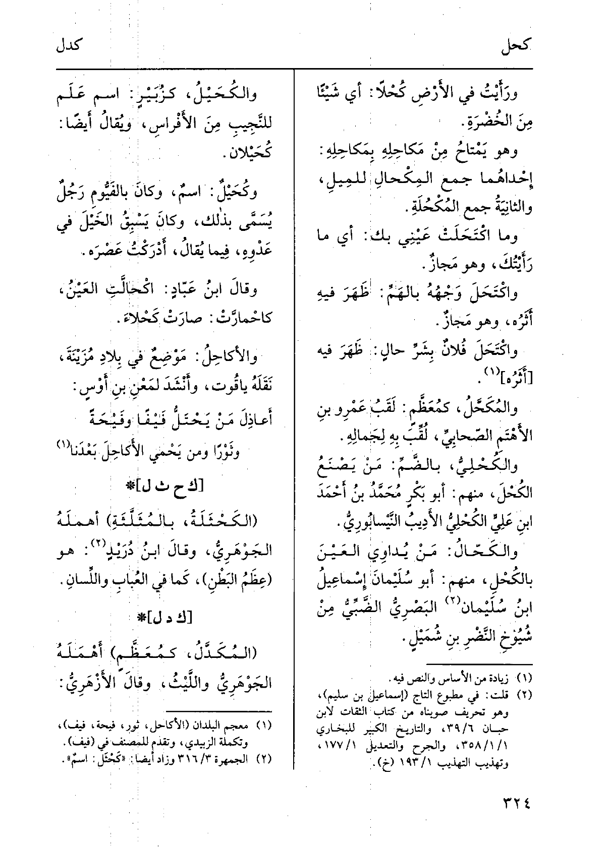 ورأيتُ فِي الأرضِ كُحْلاً: أَي شَيْئا من الخُضرَة. وَهُوَ يَمْتَاحُ من مَكاحِلِه بمَكاحِلِه: إِحْدَاهمَا جمع المِكْحالِ للمِيلِ، والثانيةُ جمعُ المُكْحُلَة. وَمَا اكْتَحلَتْ عَيْنِي بك: أَي مَا رأيتُكَ، وَهُوَ مَجاز. واكْتَحلَ وجهُه بالهَمِّ: ظهرَ فِيهِ أثرُه، وَهُوَ مَجاز. واكْتَحلَ فلانٌ بشَرِّ حالٍ: ظَهَرَ فِيهِ أثرُه. والمُكَحَّل، كمُعَظَّمٍ: لقَبُ عَمْرِو بنِ الأهتَمِ الصحابيِّ، لُقِّبَ بِهِ لجمالِه. والكُحْلِيُّ، بالضَّمّ: من يصنعُ الكُحْلَ، مِنْهُم: أَبُو بكرٍ مُحَمَّد بن احمدَ بن عليٍّ الكُحْلِيُّ الأديبُ النَّيْسابوريّ. والكَحّال: من يُداوي العَينَ بالكُحْلِ، مِنْهُم: أَبُو سُلَيْمانَ إسماعيلُ بنُ سُلَيْمانَ البَصْريُّ الضَّبِّيُّ من شيوخِ النَّضرِ بنِ شُمَيْلٍ. والكُحَيْل، كزُبَيْر: اسْم عَلَم للنَّجيبِ من الأفْراس، وَيُقَال أَيْضا: كُحَيْلان. وكُحَيْلٌ: اسمٌ، وَكَانَ بالفَيُّومِ رجلٌ يُسمّى بذلك، وَكَانَ يَسْبِقُ الخَيلَ فِي عَدْوِه، فِيمَا يُقَال، أَدْرَكتُ عَصْرَه. وَقَالَ ابنُ عَبَّادٍ: اكْحالَّتِ العَينُ، كاحْمارَّتْ: صارتْ كَحْلاء. والأكاحِل: مَوْضِعٌ فِي بلادِ مُزَيْنَةَ، نَقله ياقوت، وأنشدَ لمعَنِ بنِ أَوْسٍ:)