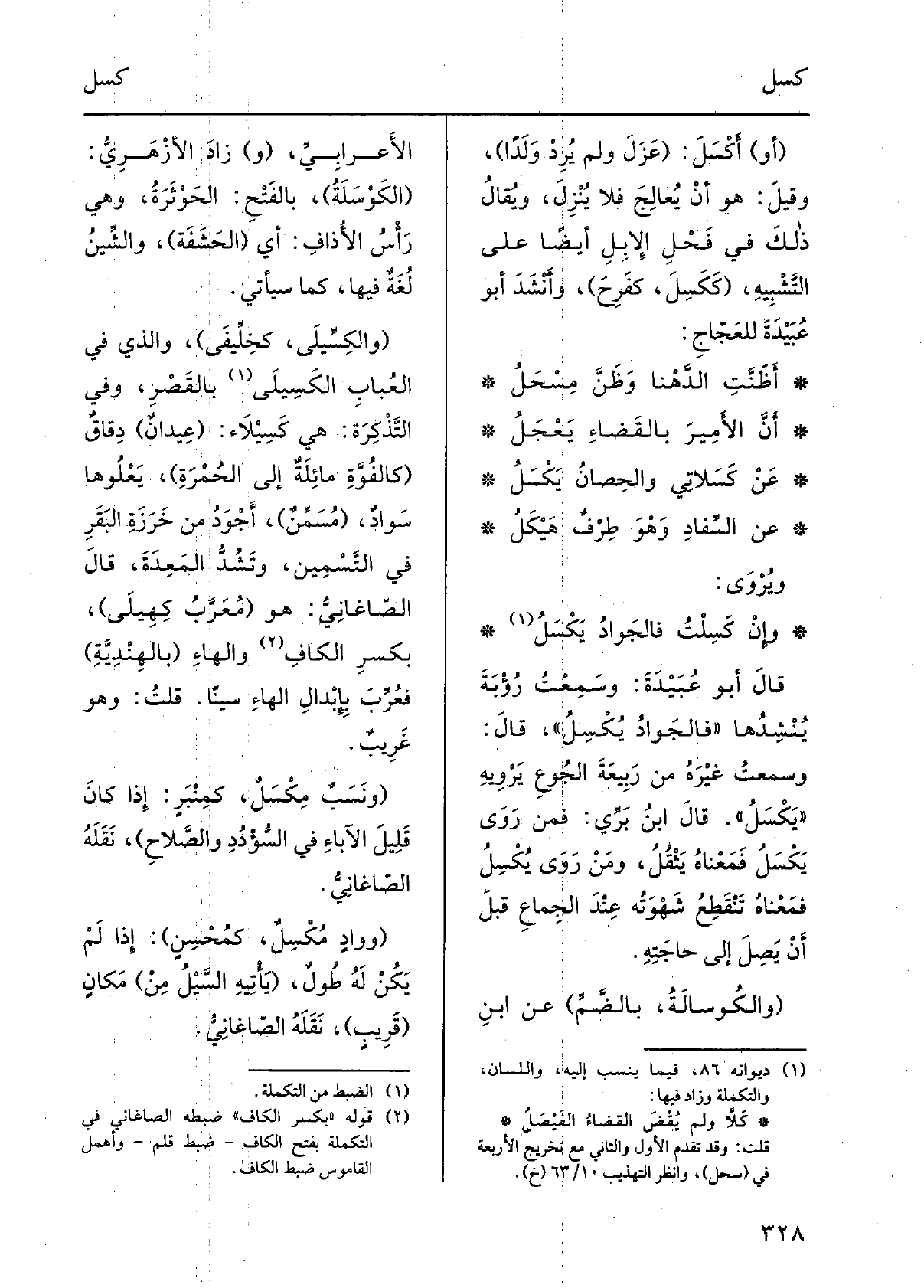 أنَّ الأميرَ بالقَضاءِ يَعْجَلُ عَن كَسَلاتي والحِصانُ يَكْسَلُ عَن السِّفادِ وَهْوَ طِرْفٌ هَيْكَلُ ويُروى: وإنْ كَسِلْتُ فالجَوادُ يَكْسَلُ قَالَ أَبُو عُبَيْدةَ: وسمعتُ رُؤبةَ يُنشِدُها: فالجَوادُ يُكْسِلُ، قَالَ: وسمعتُ غيرَه من رَبيعةَ الجُوعِ يَرْوِيه: يَكْسَلُ، قَالَ ابنُ بَرِّي: فَمن روى يَكْسَلُ فَمَعْنَاه يَثْقُلُ، وَمن روى يُكْسِلُ فَمَعْنَاه تنقطِعُ شَهْوَتُه عندَ الجِماعِ قبلَ أَن يصلَ إِلَى حاجتِه. والكُوسالَة، بالضَّمّ عَن ابْن الأَعْرابِيّ، زَاد الأَزْهَرِيّ الكَوْسَلَةُ، بالفَتْح: الحَوْثَرَة، وَهِي رأسُ الأُذافِ: أَي الحَشَفة، والشِّينُ لغةٌ فِيهَا.