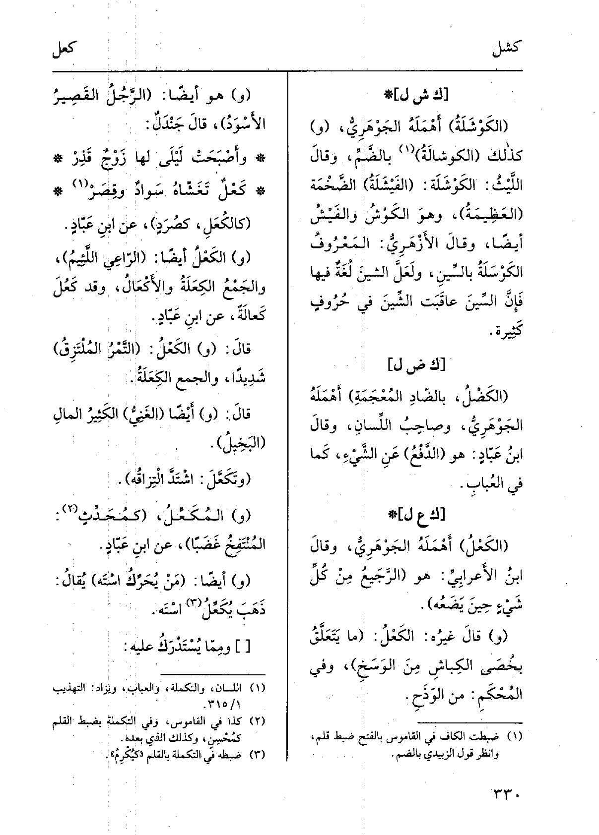 الكَعْلُ أَهْمَلَه الجَوْهَرِيّ، وَقَالَ ابْن الأَعْرابِيّ: هُوَ الرَّجيعُ من كلِّ شيءٍ حِين يضعُه. قَالَ غيرُه: الكَعْلُ: مَا يتعلَّقُ بخُصَى الكِباشِ من الوَسَخِ، وَفِي المُحْكَم: من الوَذَح. هُوَ أَيْضا: الرجلُ القصيرُ الأسْوَدُ، قَالَ جَنْدَلٌ: وَأَصْبَحَتْ لَيْلَى لَهَا زَوْجٌ قَذِرْ كَعْلٌ تَغَشّاهُ سَوادٌ وقِصَرْ كالكُعَلِ، كصُرَدٍ، عَن ابنِ عَبَّادٍ. الكَعْلُ أَيْضا: الرَّاعِي اللئيمُ، والجمعُ الكِعَلَةُ والأَكْعال، وَقد كَعُلَ كَعالَةً، عَن ابنِ عَبَّادٍ. قَالَ: الكَعْلُ: التَّمرُ المُلتَزِقُ شَدِيدا، والجمعُ الكِعَلَة. قَالَ: أَيْضا الغنيُّ الكثيرُ المالِ الْبَخِيل. وَتَكَعَّلَ: اشتدَّ الْتِزاقُه. المُكَعِّل، كمُحَدِّثٍ: المُنْتَفِخُ غَضَبَاً، عَن ابنِ عَبَّادٍ.
