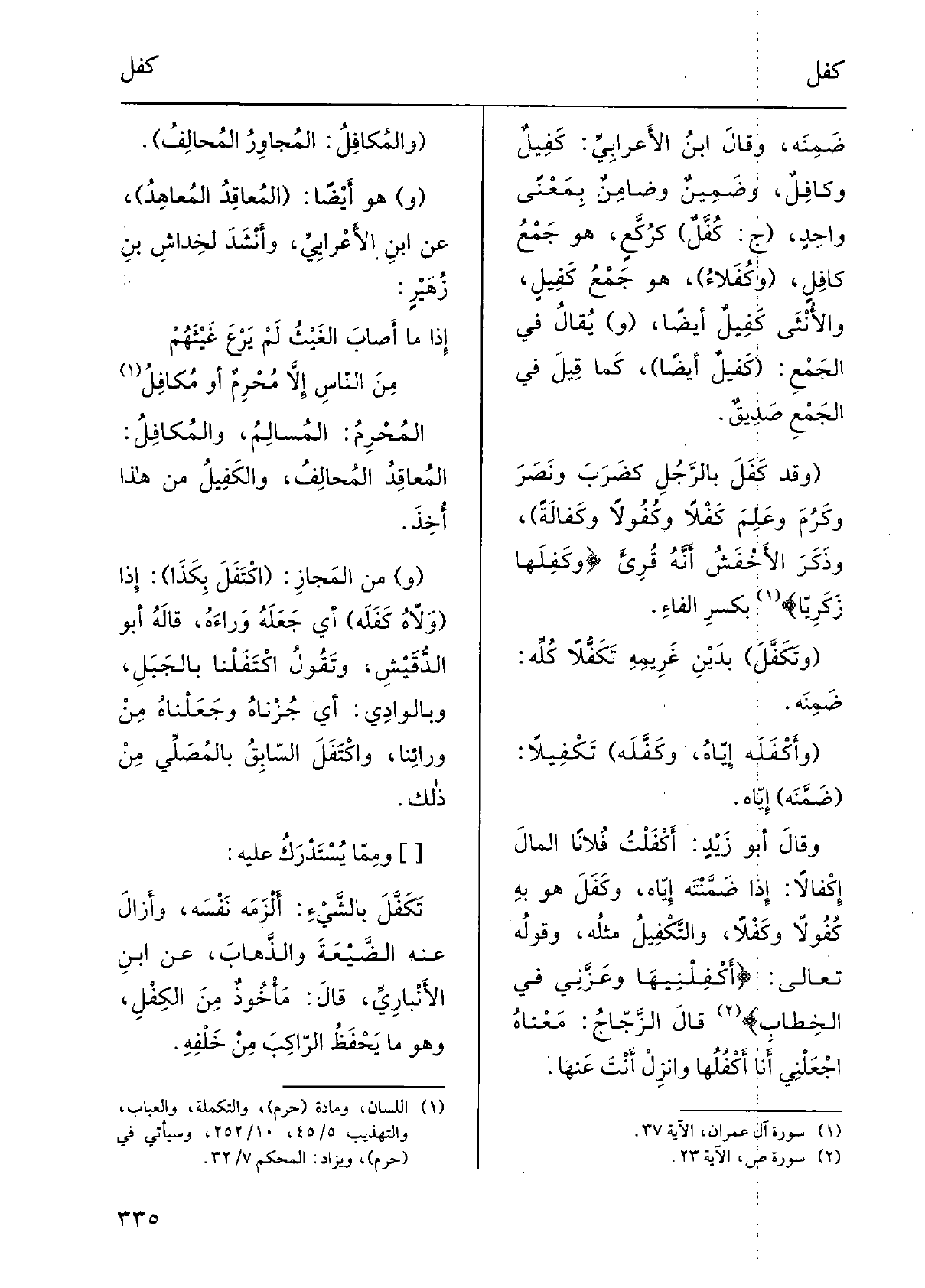 بِكَسْر الفاءِ. وتَكَفَّلَ بدَيْنِ غَريمِهِ تَكَفُّلاً كُلِّه: ضَمِنَه. وأَكْفلَه إيّاهُ، وكَفَّلَه تَكفيلاً: ضَمَّنَه إيّاهُ. وَقَالَ أَبو زيدٍ: أَكْفَلْتُ فُلاناً المالَ إكْفالاً: إِذا ضَمَّنْتَهُ إيّاه، وكَفَلَ بِهِ كُفولاً وكَفْلاً، والتَّكْفيلُ مثْلُه، وقولُه تَعَالَى: أَكْفِلْنِيها وعَزَّني فِي الخِطابِ، قَالَ الزَّجّاجُ: مَعناهُ اجْعَلْني أَنا أَكْفَلُها وانْزِلْ أَنتَ عَنْهَا.