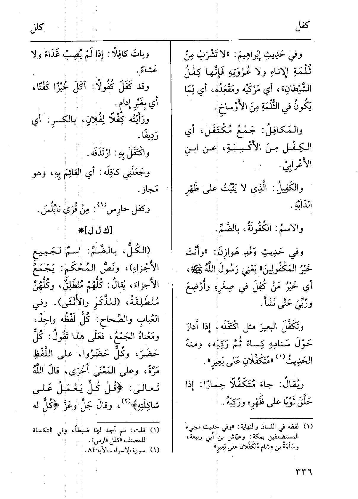 وَفِي حديثِ إبراهيمَ: لَا تَشرِبْ من ثُلْمَةِ الإناءِ وَلَا عُرْوَتِهِ فإنَّها كِفْلُ الشَّيطانِ، أَي مَرْكَبُه ومَقعَدُه، أَي لِما يَكونُ فِي الثُّلْمَةِ من الأَوساخِ. والمَكافِلُ: جمعُ مُكْتَفَل، أَي الكِفْل من الأَكسِيَةِ، عَن ابْن الأَعْرابِيِّ. وَالْكَفِيل: الَّذِي لَا يَثبُتُ على ظَهر الدَّابّةِ. والاسمُ: الكُفُولَةُ، بالضَّمِّ. وَفِي حديثِ وَفدِ هَوازِنَ: وأَنتَ خَيرُ المَكفولينَ. يَعني رَسُول الله صلّى الله عَلَيْهِ وسلَّمَ، أَي خيرُ مَن كُفِلَ فِي صِغَرِهِ وأُرْضِعَ ورُبِّيَ حتّى نشأَ. وتَكَفَّلَ البعيرَ مثل اكْتفلَ، إِذا أَدارَ حولَ سَنامِهِ كِساءً ثُمَّ ركِبَهُ، وَمِنْه الحَدِيث: مُتَكَفِّلانِ على بعيرٍ. ويُقال: جاءَ مُتَكَفِّلاً حِماراً: إِذا حَلَّقَ ثَوْباً على ظهرِه وركِبَهُ. وباتَ كافِلاً: إِذا لَمْ يُصِبْ غَداءً وَلَا عَشاءً. وَقد كَفَلَ كُفولاً: أَكلَ خُبزاً كَفْتاً، أَي بغيرِ إدامٍ. ورأَيتُهُ كِفْلاً لِفُلانٍ، بالكسرِ أَي رَديفاً. واكْتَفَلَ بِهِ: ارْتَدَفَهُ.
