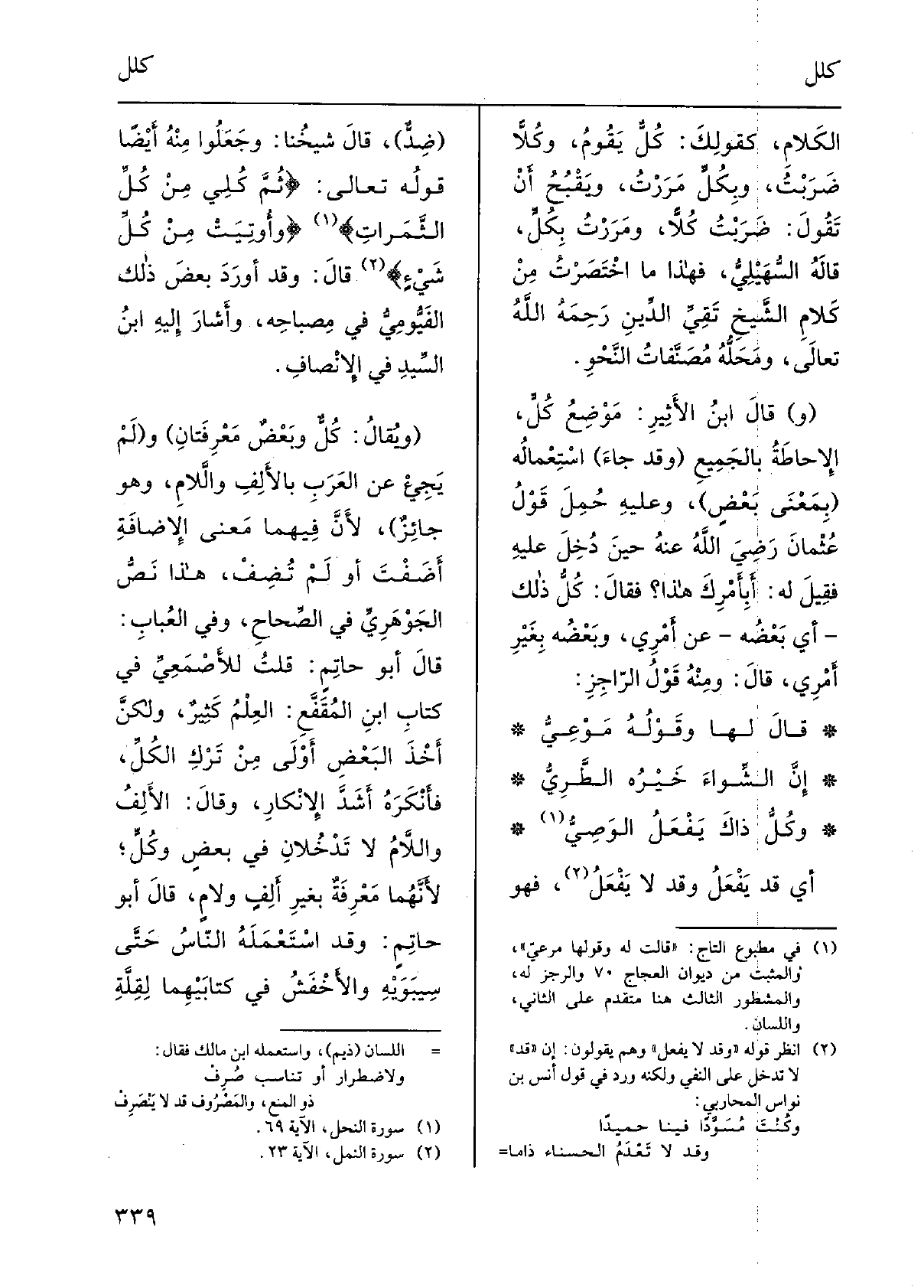الكلامِ، كقولِكَ: كُلٌّ يَقومُ، {وكُلاًّ ضرَبْتُ،} وبِكُلٍّ مرَرْتُ، ويَقْبُحُ أَنْ تقولَ: ضرَبْتُ كُلاًّ، ومرَرْتُ {بكُلٍّ، قَالَه السُّهَيْلِيُّ، فَهَذَا مَا اخْتصَرْت من كَلَام الشيخِ تَقِيّ الدينِ رَحمَه الله تَعَالَى، ومَحَلُّه مُصَنَّفاتُ النَّحْوِ. قَالَ ابنُ الأَثير: مَوضِعُ كُلٍّ، الإحاطَةُ بالجَميعِ، وَقد جَاءَ استِعمالُه بِمَعْنى بَعْضٍ، وَعَلِيهِ حُمِلَ قولُ عُثمانَ رَضِي الله عَنهُ حينَ دُخِلَ عَلَيْهِ فَقيل لَهُ: أَبأَمرِكَ هَذَا فَقَالَ: كُلُّ ذلكَ أَي بعضُه عَن أَمري، وبعضُه بِغَيْر أَمري، قَالَ: وَمِنْه قولُ الرّاجِزِ: قَالَ لَهَا وقولُهُ مَوْعِيُّ إنَّ الشِّواءَ خيرُه الطَّرِيّ} وكلُّ ذاكَ يفعَلُ الوَصِيُّ أَي قد يَفعَلُ وَقد لَا يَفعَلُ، فَهُوَ ضِدُّ، قَالَ شيخُنا: وَجعلُوا مِنْهُ أَيضاً قولُه تَعَالَى: ثُمَّ كُلي من كُلِّ الثَّمَراتِ وأُوْتِيَتْ من كُلِّ شيءٍ، قَالَ: وَقد أَوردَ بعضَ ذلكَ الفَيُّومِيُّ فِي مِصباحِه، وأَشارَ إِلَيْهِ ابنُ السَّيِّدِ فِي الإنصافِ. ويُقال: كُلٌّ وبَعْضٌ مَعرِفتانِ، وَلم يَجئْ عَن العربِ بالأَلِفِ واللامِ، وَهُوَ جائزٌ، لأَنَّ فيهمَا معنى الإضافَةِ أَضَفْتَ أَو لمْ تُضِفْ، هَذَا نَصُّ الجَوْهَرِيّ فِي الصحاحِ، وَفِي العُبابِ: قَالَ أَبو حاتِمٍ: قلتُ للأَصْمَعِيِّ فِي كتابِ ابنِ المُقَفَّعِ: العِلْمُ كثيرٌ، ولكنَّ أَخْذَ البعضِ) أَوْلَى من تَرْكِ الكُلِّ، فأَنكَرَهُ أَشَدَّ الإنكارِ، وَقَالَ: الأَلِفُ واللاّمُ لَا تَدخُلانِ فِي بعضٍ وكُلٍّ، لأَنَّهما مَعرِفَةٌ بِغَيْر أَلِفٍ ولامٍ، قَالَ أَبو حاتِمٍ: وَقد استعملَه النّاسُ حتّى سيبويهِ والأَخْفَشُ فِي كتابيهِما لِقِلَّةِ