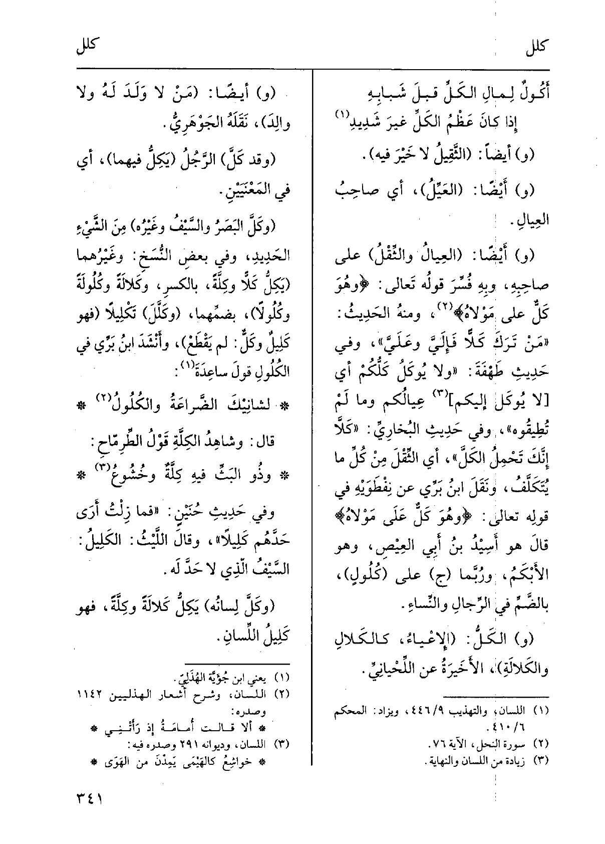 أَيضاً: الثَّقيلُ لَا خَيرَ فِيهِ. أَيضاً: العَيِّلُ، أَي صاحِبُ العِيالِ. أَيضاً: العِيالُ والثِّقْلُ على صاحِبِهِ، وَبِه فُسِّرَ قولُه تَعَالَى: وهُوَ {كَلٌّ على مَولاهُ، وَمِنْه الحديثُ: مَن تَرَكَ} كَلاًّ فإلَيَّ وعَلَيَّ، وَفِي حديثِ طَهْفَةَ: وَلَا يُوكَلُ {كَلُّكُم أَي لَا يُوكَلُ إِلَيْكُم عِيالُكم وَمَا لم تُطيقوه. وَفِي حديثِ البُخاريِّ: كَلاّ إنّكَ تحملُ الكَلَّ، أَي الثِّقْلَ من كُلِّ مَا يُتَكَلَّفُ، ونقلَ ابنُ بَرِّي عَن نِفْطَوَيْهِ فِي قَوْله تَعالى: وهوَ كَلُّ على مَولاه قَالَ هُوَ أَسيدُ بنُ أبي العِيْصِ، وَهُوَ الأَبْكَم، وربّما ج على} كُلولٍ بالضَّمّ فِي الرِّجالِ وَالنِّسَاء. الكَلُّ: الإعْياء، {كالكَلالِ} والكَلالَة، الأخيرةُ عَن اللِّحْيانِيّ. أَيْضا: مَن لَا وَلَدَ لَهُ وَلَا والِدَ، نَقله الجَوْهَرِيّ. وَقد كَلَّ الرجلُ {يَكِلُّ فيهمَا، أَي فِي المَعنيَيْن.} وكَلَّ البصَرُ والسيفُ وغيرُه من الشيءِ الحديدِ، وَفِي بعضِ النّسخ: وغيرُهما {يَكِلُّ} كَلاًّ {وكِلَّةً، بالكَسْر،} وكَلالَةً {وكُلولَةً} وكُلولاً، بضمِّهما، {وكَلَّلَ} تَكْلِيلاً فَهُوَ {كَليلٌ وكَلٌّ: لم يقطعْ، وأنشدَ ابنُ بَرِّي فِي} الكُلولِ قولَ)