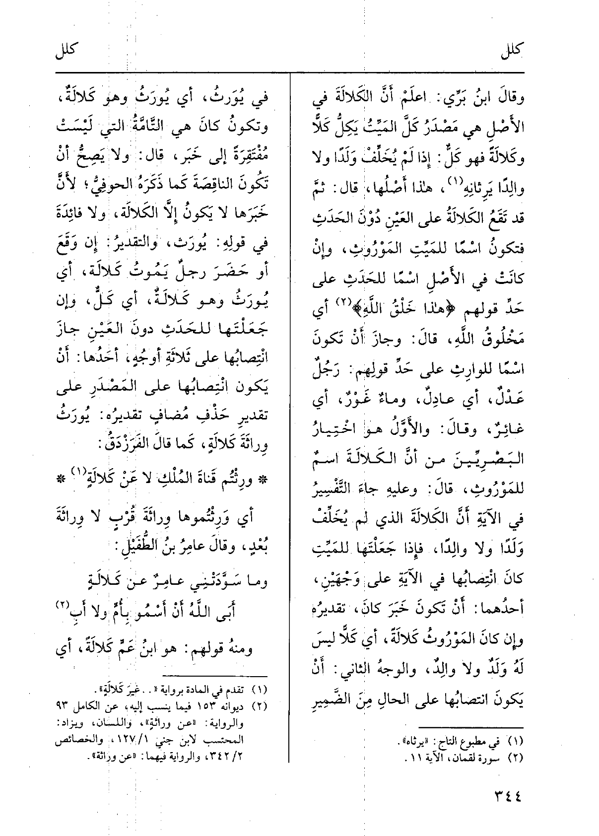 وَقَالَ ابنُ بَرِّي: اعلَمْ أنّ الكَلالَة فِي الأصلِ هِيَ مصدرُ كَلَّ الميِّتُ يَكِلُّ كَلاًّ! وكَلالَةً فَهُوَ كَلٌّ: إِذا لم يُخَلِّفْ وَلَدَاً وَلَا والِداً يَرِثانِه، هَذَا أصلُها، قَالَ: ثمّ قد تقعُ الكَلالَة على العينِ دونَ الحدَثِ فتكونُ اسْما للميِّتِ المَوْروثِ، وإنْ كانتْ فِي الأصلِ اسْما للحَدَثِ على حدِّ قَوْلهم: هَذَا خَلْقُ اللهِ أَي مَخْلُوقُ اللهِ، قَالَ: وجازَ أَن تكونَ اسْما للوارثِ على حدِّ قولِهم: رجلٌ عَدْلٌ، أَي عادلٌ، وماءٌ غَوْرٌ، أَي غائِرٌ، وَقَالَ: والأوّلُ هُوَ اختيارُ البَصْرِيِّينَ من أنّ الكَلالَةَ اسمٌ للموروث، قَالَ: وَعَلِيهِ جاءَ التفسيرُ فِي الآيةِ أنّ الكَلالَةَ الَّذِي لم يُخَلِّفْ وَلَدَاً وَلَا والِداً، فَإِذا جَعَلْتَها للميتِ كَانَ انتِصابُها فِي الآيةِ على وَجْهَيْن، أحدُهما: أَن تكونَ خَبَرَ كَانَ، تقديرُه وَإِن كَانَ المَوروثُ كَلالَةً، أَي كَلاًّ لَيْسَ لَهُ ولَدٌ وَلَا والِدٌ، والوجهُ الثَّانِي: أَن يكونَ انتصابُها على الحالِ من الضميرِ فِي يُورَثُ، أَي يُورَثُ وَهُوَ كَلالَةٌ، وتكونُ كَانَ هِيَ التامّةُ الَّتِي لَيست مُفْتَقِرَةً إِلَى خَبَر، قَالَ: وَلَا يصِحُّ أنْ تكونَ الناقصةَ كَمَا ذَكَرَه الحوفِيُّ لأنّ خَبَرَها لَا يكونُ إلاّ الكَلالَة، وَلَا فائدةَ فِي قولِه: يُورَث، وَالتَّقْدِير: إِن وَقَعَ أَو حَضَرَ رجلٌ يموتُ كَلالَة، أَي يُورَثُ وَهُوَ كَلالَةٌ، أَي كَلٌّ، وَإِن جَعَلْتَها للحَدَثِ دونَ العينِ جازَ انتصابُها على ثلاثةِ أَوْجُهٍ، أحدُها: أَن يكونَ انتصابُها على المصدرِ على تقديرِ حَذْفِ مُضافٍ تقديرُه: يُورَثُ وِراثَةَ كَلالَةٍ، كَمَا قَالَ الفرَزْدقُ:) وَرِثْتُم قَناةَ المُلكِ لَا عَن كَلالَةٍ أَي وَرِثْتموها وِراثَةَ قُربٍ لَا وِراثَةَ بُعدٍ، وَقَالَ عامرُ بنُ الطُّفَيْل: