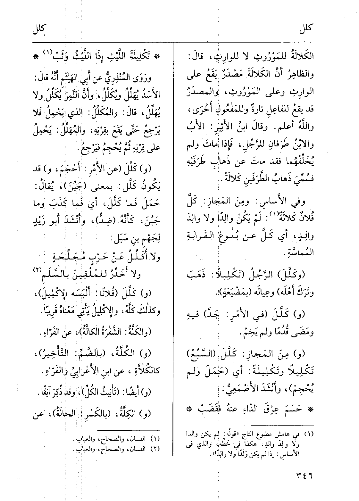 الكَلالةُ للمَوروثِ لَا للوارثِ، قَالَ: والظاهرُ أنّ الكَلالَةَ مصدرٌ يقعُ على الوارثِ وعَلى المَوروثِ، والمصدرُ قد يقعُ للفاعلِ تَارَة وللمَفعولِ أُخرى، واللهُ أعلم. وَقَالَ ابنُ الْأَثِير: الأبُ والابْنُ طَرَفَانِ للرجلِ، فَإِذا ماتَ وَلم يُخَلِّفْهُما فقد ماتَ عَن ذهابِ طَرَفَيْهِ فسُمِّيَ ذهابُ الطرفَيْنِ كَلالَةً. وَفِي الأساس: ومنَ المَجاز: كَلَّ فلانٌ كَلالَةً: لم يكن والِداً وَلَا والِدَ والِدٍ، أَي كَلَّ عَن بلوغِ القَرابةِ المُماسَّةِ. {وكَلَّلَ الرجلَ} تَكْلِيلاً: ذَهَبَ وتَرَكَ أَهْلَه وَعِيَاله بمَضْيَعَةٍ. (و) {كَلَّلَ فِي الْأَمر:) جَدَّ فِيهِ وَمضى قُدُماً وَلم يَخِمْ. منَ المَجاز: كلَّلَ السَّبُعُ تَكْلِيلاً} وتَكْلِيلَةً: أَي حَمَلَ وَلم يُحجِمْ، وَأنْشد الأَصْمَعِيّ: حَسَمَ عِرْقَ الداءِ عَنهُ فَقَضَبْ {تَكْلِيلَةَ الليثِ إِذا الليثُ وَثَبْ وروى المُنذِريُّ عَن أبي الهَيثمِ أنّه قَالَ: الأسدُ يُهَلِّلُ} ويُكَلِّلُ، وأنّ النَّمِرَ {يُكَلِّلُ وَلَا يُهَلِّلُ، قَالَ:} والمُكَلِّلُ: الَّذِي يحملُ فَلَا يرجعُ حَتَّى يَقَعَ بقِرْنِه، والمُهَلِّل: يحملُ على قِرْنِه ثمّ يُحجِمُ فَيَرْجِعُ.