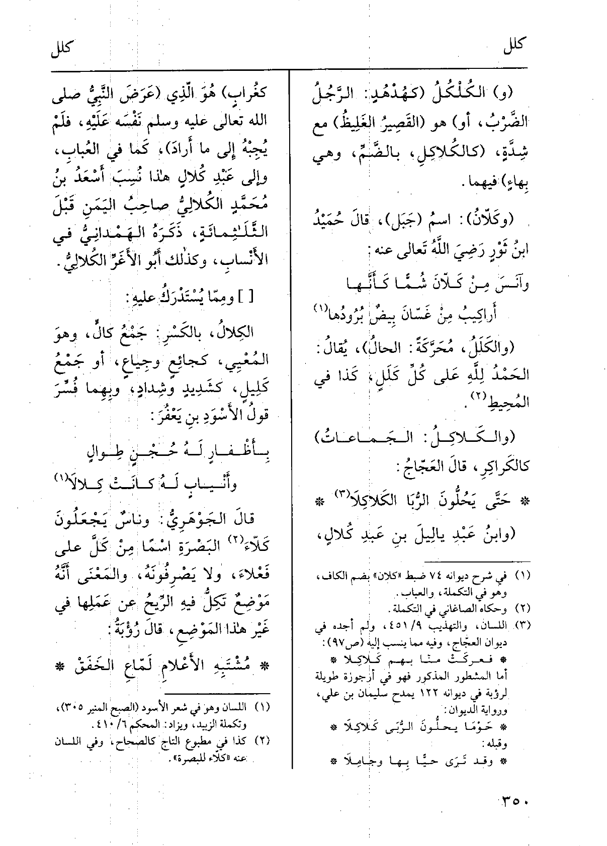 {والكَلَلُ، مُحَرَّكَةً: الحالُ، يُقَال: الحمدُ للهِ على كلِّ} كَلَلٍ، كَذَا فِي المُحيط. {والكَلاكِل: الجماعاتُ كالكَراكِر، قَالَ العَجّاج: حَتَّى يَحُلُّونَ الرُّبا} الكَلاكِلا وابنُ عَبْدِ ياليلَ بنِ عَبْدِ {كُلالٍ، كغُرابٍ هُوَ الَّذِي عَرَضَ النبيُّ صلّى الله تَعَالَى عَلَيْهِ وسلَّم نَفْسَه عَلَيْهِ، فَلم يُجبْه إِلَى مَا أرادَ، كَمَا فِي العُباب، وَإِلَى عَبْدِ كُلالٍ هَذَا نُسِبَ أَسْعَدُ بنُ محمدٍ} الكُلالِيُّ صاحبُ اليمنِ قَبْلَ الثلاثمائةِ، ذَكَرَه الهَمْدانيُّ فِي الأنْسابِ، وَكَذَلِكَ أَبُو الأَغَرِّ الكُلالِيُّ. ومِمّا يُسْتَدْرَك عَلَيْهِ: {الكِلال، بالكَسْر: جَمْعُ} كالٍّ، وَهُوَ المُعْيِي، كجائعٍ وجِياعٍ، أَو جَمْعُ {كَليلٍ، كشَديدٍ وشِدادٍ، وَبِهِمَا فُسِّرَ قولُ الأسْوَدِ بن يَعْفُرَ: