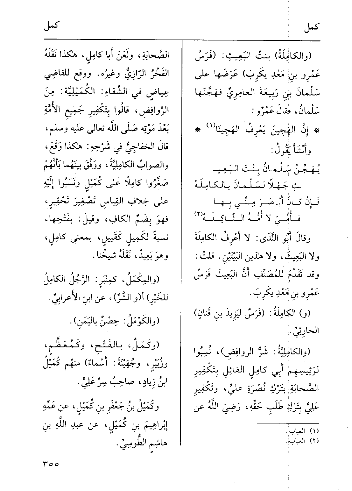وَقَالَ أَبُو النَّدى: لَا أعرفُ الكامِلَةَ وَلَا البَعيث، وَلَا هذَيْن البيتَيْن. قلتُ: وَقد تقدّمَ للمُصَنِّف أنَّ البَعيثَ فرَسُ عَمْرِو بن مَعْدِ يَكْرِبَ. الكامِلَة: فرَسٌ ليَزيدَ بن قَنانٍ الحارِثيِّ. والكامِلِيّة: شَرُّ الروافِضِ، نُسبوا لرئيسِهم أبي كاملٍ القائلِ بتَكفيرِ الصحابةِ بتَركِ نُصرَةِ عليٍّ، وتَكفيرِ عليٍّ بتَركِ طَلَبِ حَقِّه، رَضِيَ اللهُ عَن الصحابةِ، ولَعَنَ أَبَا كاملٍ، هَكَذَا نَقَلَه الفَخرُ الرازِيُّ وغيرُه، وَوَقع للْقَاضِي عِياضٍ فِي الشِّفاء: الكُمَيْلِيَّة: من الرَّوافِض، قَالُوا بتَكفيرِ جميعِ الأُمّةِ بعدَ مَوْتِه صلّى الله تَعَالَى عَلَيْهِ وسلَّم، قَالَ الخَفاجيُّ فِي شَرْحِه: هَكَذَا وَقَعَ، والصوابُ الكامِليّة، ووفَّقَ بَينهمَا بأنّهم صَغَّروا كامِلاً على كُمَيْلٍ وَنَسَبوا إِلَيْهِ على خِلافِ القياسِ تصغيرَ تَحقيرٍ، فَهُوَ بضمِّ الكافِ، بِمَعْنى كامِلٍ، وَهُوَ بعيدٌ، نَقَلَه شيخُنا. والمِكْمَل، كمِنبَرٍ: الرجلُ الكامِلُ للخَيرِ أَو الشَّرِّ، عَن ابْن الأَعْرابِيّ. والكَوْمَل: حِصنٌ بِالْيمن. وَكَمْلٌ، بالفَتْح، وكمُعَظَّمٍ، وزُبَيْرٍ، وجُهَيْنةَ: أسماءٌ)