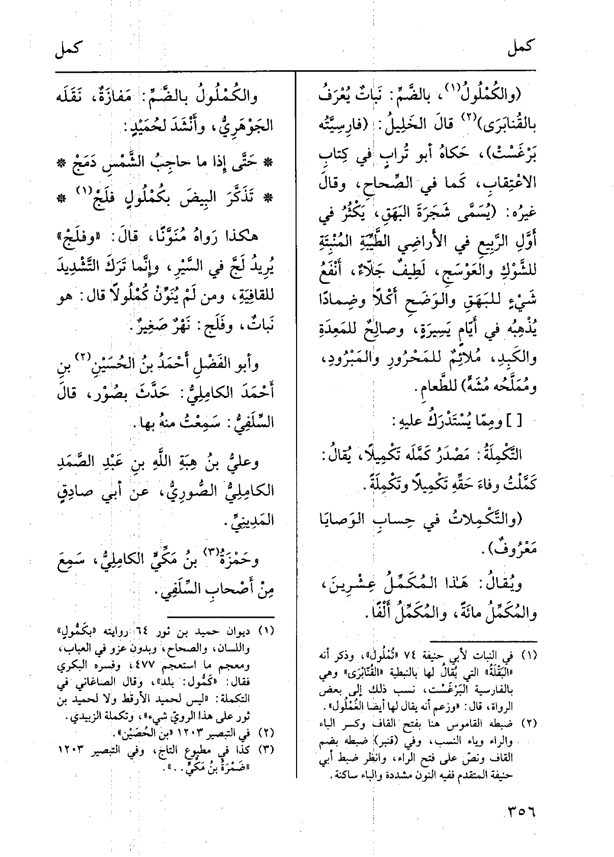 والكُمْلول، بالضَّمّ: نباتٌ يُعرفُ بالقُنابَرى، قَالَ الْخَلِيل: فارِسيّتُه بَرْغَسْتْ، حَكَاهُ أَبُو تُرابٍ فِي كتابِ الاعْتِقاب، كَمَا فِي الصِّحاح، وَقَالَ غيرُه: يُسمّى شَجَرَةَ البَهَقِ، يَكْثُرُ فِي أوّلِ الربيعِ فِي الْأَرَاضِي الطَّيِّبةِ المُنبِتةِ للشَّوكِ والعَوْسَج، لطيفٌ جَلاءٌ، أَنْفَعُ شيءٍ للبَهَقِ والوَضَحِ أَكْلاً وضِماداً يُذهبُه فِي أيّامٍ يَسيرَةٍ، وصالِحٌ للمَعِدَةِ والكَبِدِ، مُلائِمٌ للمَحْرورِ والمَبْرود، ومُمَلَّحُه مُشَهٍّ للطعامِ. ومِمّا يُسْتَدْرَك عَلَيْهِ: التَّكْمِلَة: مصدرُ كمَّلَه تَكْمِيلاً، يُقَال: كَمَّلْتُ وفاءَ حقِّه تَكْمِيلاً وتَكْمِلَةً. والتَّكْمِلاتُ فِي حسابِ الوَصايا مَعْرُوفٌ. وَيُقَال: هَذَا المُكَمِّلُ عِشرينَ والمُكَمِّلُ مائَة، والمُكَمِّلُ أَلْفَاً. والكُمْلولُ بالضَّمّ: مَفازَةٌ، نَقله الجَوْهَرِيّ، وأنشدَ لحُمَيْد: حَتَّى إِذا مَا حاجِبُ الشمسِ دَمَجْ تذَكَّرَ البِيضَ بكُمْلولٍ فَلَجْ هَكَذَا رَوَاهُ مُنوَّناً، قَالَ: وَفَلَجْ، يريدُ لَجَّ فِي السَّيرِ، وإنّما تَرَكَ التشديدَ للقافيةِ، وَمن لم يُنَوِّنْ كُمْلولاً قَالَ: هُوَ نباتٌ، وَفَلَج: نهرٌ صغيرٌ. وَأَبُو الفَضْلِ أحمدُ بنُ الحسينِ بن أحمدَ الكامِلِيُّ: حدَّثَ بصُور، قَالَ السِّلَفيُّ: سَمِعْتُ مِنْهُ بهَا. وعليُّ بن هِبَةِ اللهِ بن عَبْدِ الصَّمَدِ الكامِليُّ الصُّوريُّ، عَن أبي صادقٍ المَدينيِّ. وَحَمْزَةُ بنُ مكِّيٍّ الكامِليُّ، سَمِعَ من أصحابِ السِّلَفي.