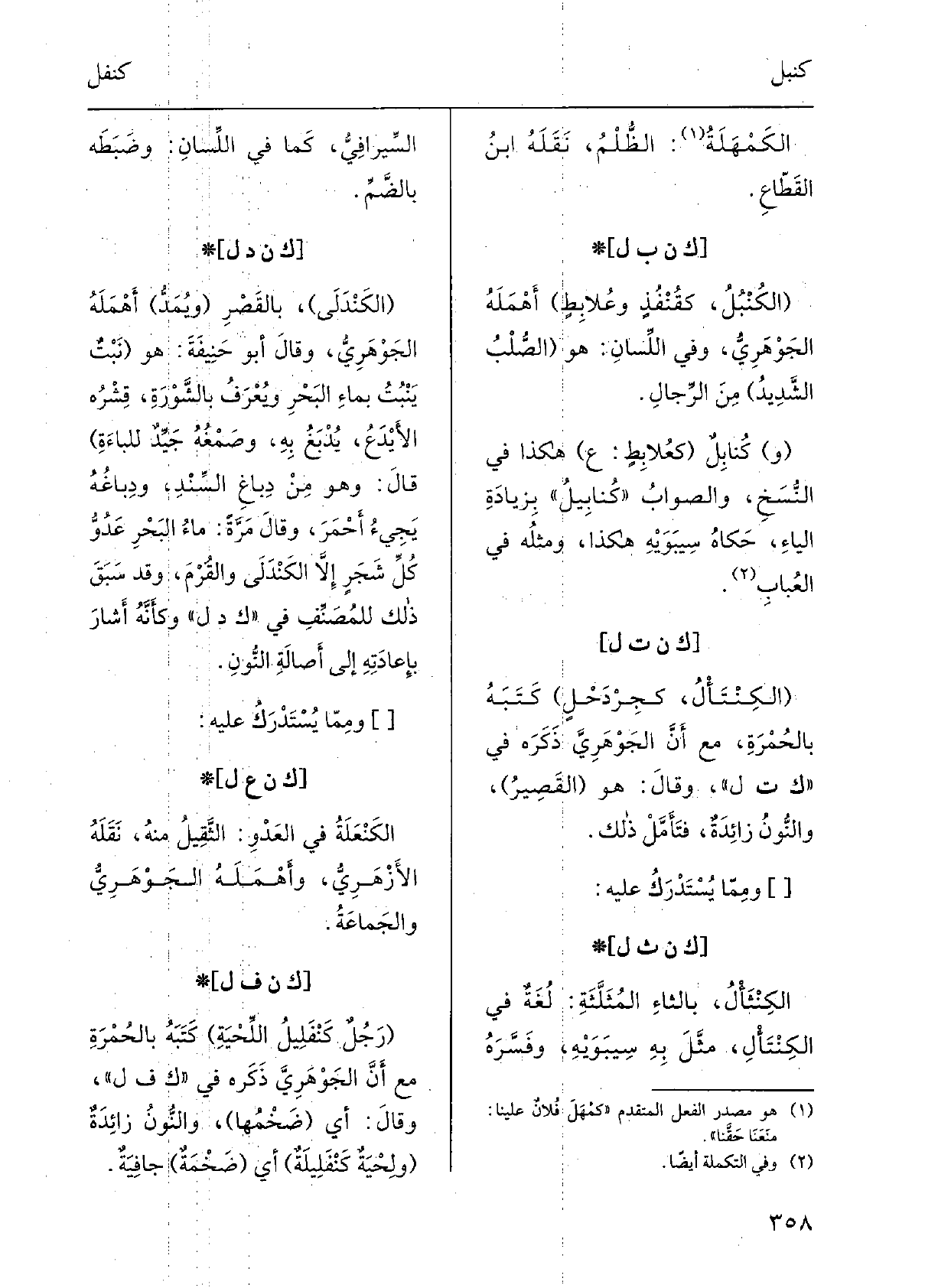 رجلٌ كَنْفَلِيلُ اللِّحيَةِ كَتَبَه بالحُمرَةِ مَعَ أنّ الجَوْهَرِيّ ذَكَرَه فِي كفل، وَقَالَ: أَي ضَخْمُها، والنونُ زائدةٌ ولِحيَةٌ كَنْفَلِيلَةٌ أَي ضخمةٌ جافِيَةٌ.
