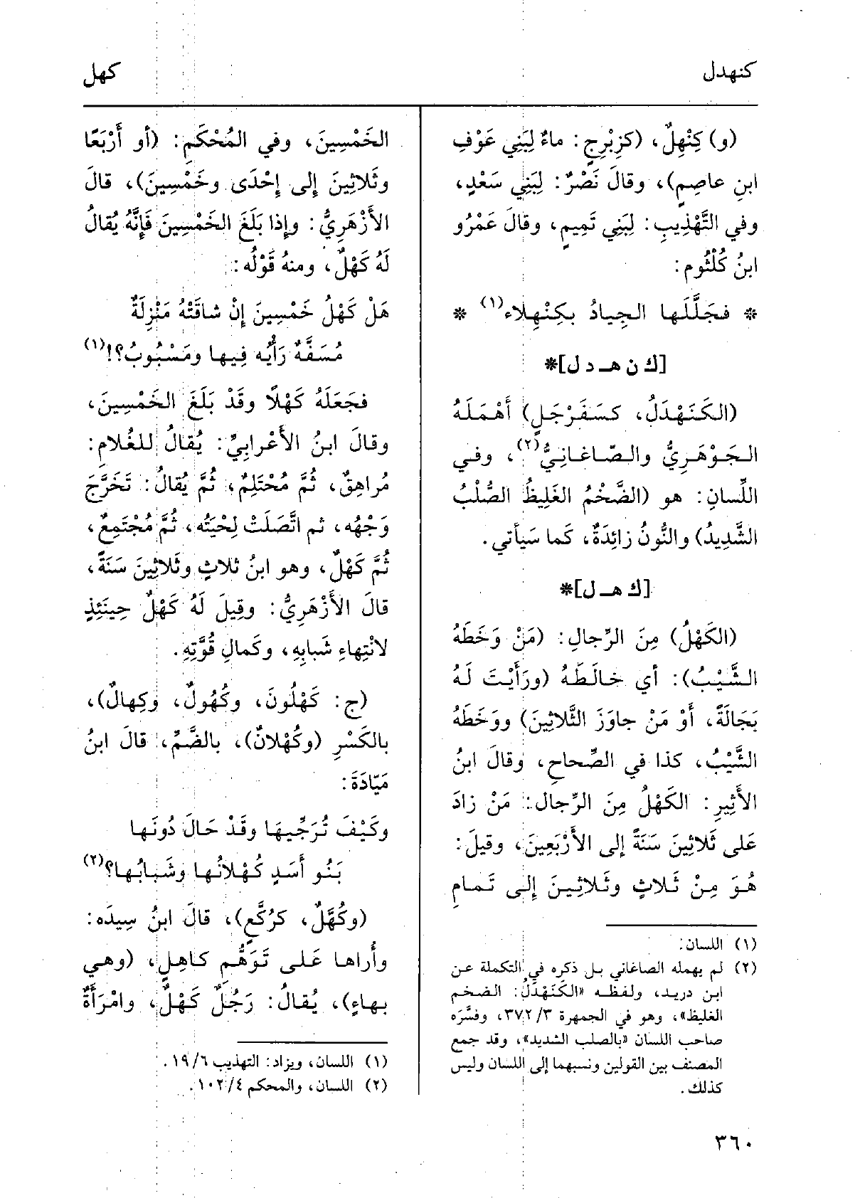 فجعلَه كَهلاً وَقد بلغَ الخمسينَ، وَقَالَ ابْن الأَعْرابِيِّ: يُقال للغلامِ: مُراهِقٌ، ثمَّ مُحْتَلِمٌ، ثمَّ يُقَال: تخَرَّجَ وجْهُه، ثمَّ اتَّصلَتْ لِحيَتُه، ثمَّ مُجتَمِعٌ، ثمَّ كَهْلٌ، وَهُوَ ابنُ ثلاثٍ وثلاثينَ سنة، قَالَ الأَزْهَرِيّ: وَقيل لَهُ كَهْلٌ حينئذٍ لانتهاءِ شبابِهِ، وَكَمَال قوَّته. ج: كَهْلونَ، وكُهولٌ، وكِهالٌ، بالكَسْرِ، وكُهْلانٌ، بالضَّمِّ، قَالَ ابنُ مَيّادَةَ: