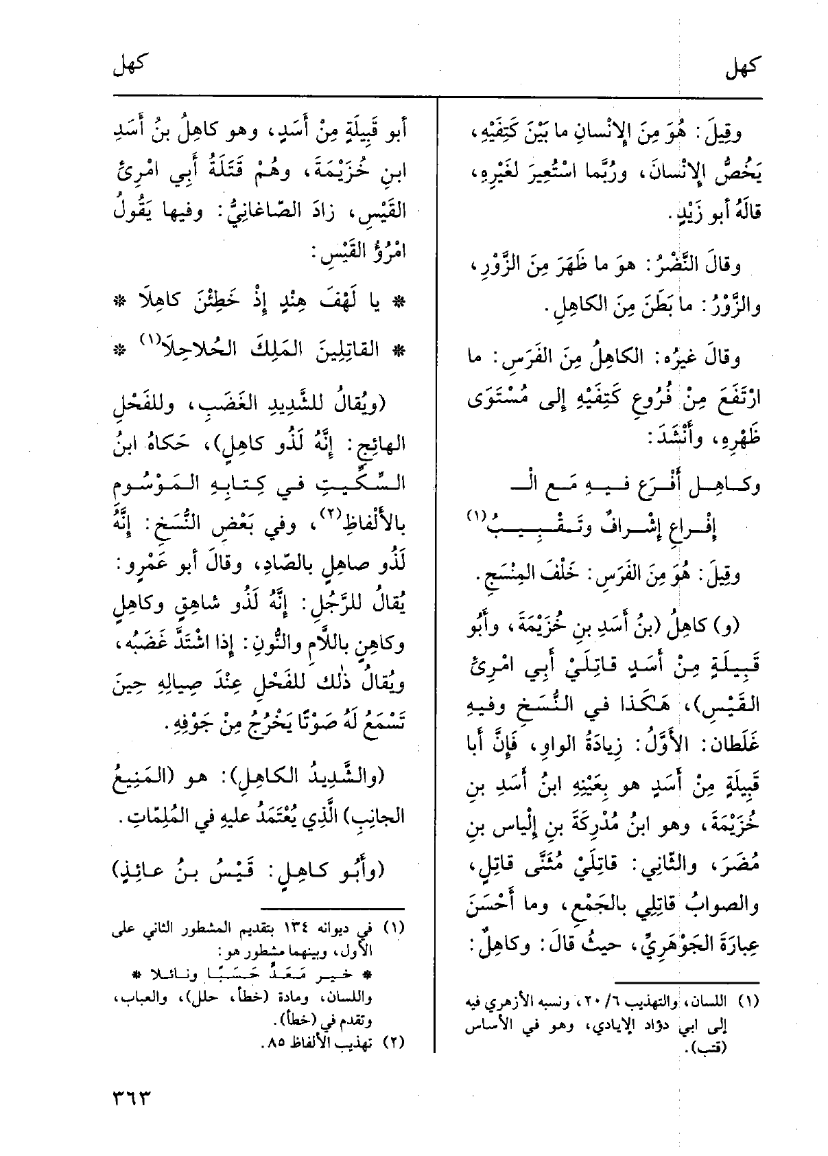 وَقيل: هُوَ من الفرَسِ: خلفَ المِنْسَجِ. وكاهلُ بنُ أَسَدِ بنِ خُزَيمةَ، وأَبو قبيلَةٍ من أَسَدٍ قاتِلَي أَبي امْرئِ القَيسِ، هَكَذَا فِي النُّسَخِ وَفِيه غَلَطان: الأَوَّلُ: زيادَةُ لواوِ، فإنَّ أَبا قبيلَةٍ من أَسدٍ هُوَ بعينِه ابنُ أَسَد بنِ خُزَيمَةَ، وَهُوَ ابنُ مُدْرِكَةَ بنِ إلْيَاس بنِ مُضَرَ، والثّاني: قاتلَي مُثَنَّى قاتِل، والصّوابُ قاتلِي بالجَمعِ، وَمَا أَحسنَ عبارَةَ الجَوْهَرِيِّ، حيثُ قَالَ: وكاهِلٌ: أَبو قبيلَةٍ من أَسَدٍ، وَهُوَ كاهِلُ بنُ أَسَدِ بنِ خُزَيْمَةَ، وهم قتَلَةُ أَبي امرئِ القيسِ، زَاد الصَّاغانِيُّ: وفيهَا يَقُول امْرُؤ القيسِ: يَا لَهْفَ هِنْدٍ إذْ خَطِئْنَ كاهِلا القاتِلَيْنِ المَلِكَ الحُلاحِلا ويُقال للشَّديد الغضَبِ، وللفَحْلِ الهائجِ: إنَّه لذُو كاهِلٍ، حَكَاهُ ابنُ السِّكِّيتِ فِي كتابِهِ المَوسومِ بالأَلفاظِ، وَفِي بعض النُّسَخِ: إنَّه لَذو صاهِلٍ بالصَّادِ، وَقَالَ أَبو عَمروٍ: يُقَال للرَّجل: إنَّه لذُو شاهِقٍ وكاهِلٍ وكاهِنٍ بِاللَّامِ والنُّونِ: إِذا اشتَدَّ غضَبُه، ويُقال ذلكَ لِلفحلِ عندَ صِيالِه حينَ تسمَعُ لَهُ صَوتاً يَخرُجُ من جَوفِهِ. والشَّديدُ الكاهِلِ: هُوَ المَنيعُ الجانِبِ، الَّذِي يُعتَمَدُ عَلَيْهِ فِي المُلِمّاتِ.