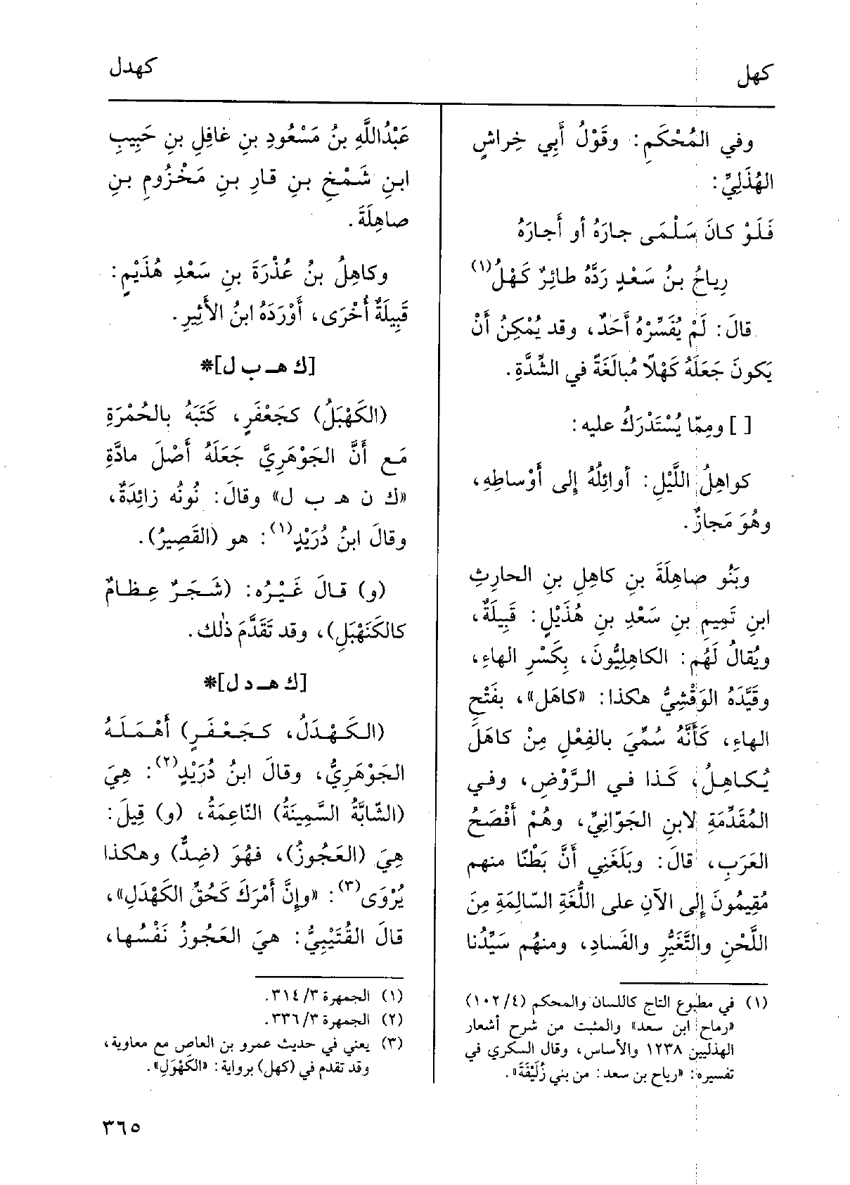 قَالَ: لمْ يُفَسِّرْه أَحَدٌ، وَقد يُمكن أَن يكونَ جعلَهُ كَهلاً مُبالَغَةً فِي الشِّدّةِ. ومِمّا يُستَدرَكُ عَلَيْهِ: كَواهِلُ اللَّيلِ: أَوائلُه إِلَى أَوساطِهِ، وَهُوَ مَجازٌ. وبَنو صاهِلَةَ بنِ كاهِلِ بنِ الحارِثِ بنِ تميمِ بنِ سعدِ بنِ هُذَيْلٍ: قبيلَةٌ، وَيُقَال لَهُم: الكاهِلِيُّونَ، بِكَسْر الهاءِ، وقَيَّدَه الوَقْشِيُّ هَكَذَا: كاهَل، بِفَتْح الهاءِ، كأَنَّه سُمِّيَ بالفِعلِ من كاهَلَ يُكاهِلُ، كَذَا فِي الرَّوضِ، وَفِي المُقدّمة لِابْنِ الجَوّانِيِّ، وهم أَفصَحُ العَرَبِ، قَالَ: وبلغَني أَنَّ بَطناً مِنْهُم مُقيمونَ إِلَى الْآن على اللُّغَةِ السّالِمَةِ من اللّحْنِ والتَّغَيُّرِ والفسادِ، وَمِنْهُم سيِّدُنا عبدُ الله بنُ مَسعودِ بنِ غافِلِ بنِ حبيبِ بنِ شَمْخِ بنِ قارِ بنِ مخزومِ بنِ صاهِلَةَ. وكاهِلُ بنُ عُذْرَةَ بنِ سعدِ هُذَيْمٍ: قبيلَةٌ أُخرى، أَوردَه ابنُ الأَثيرِ.