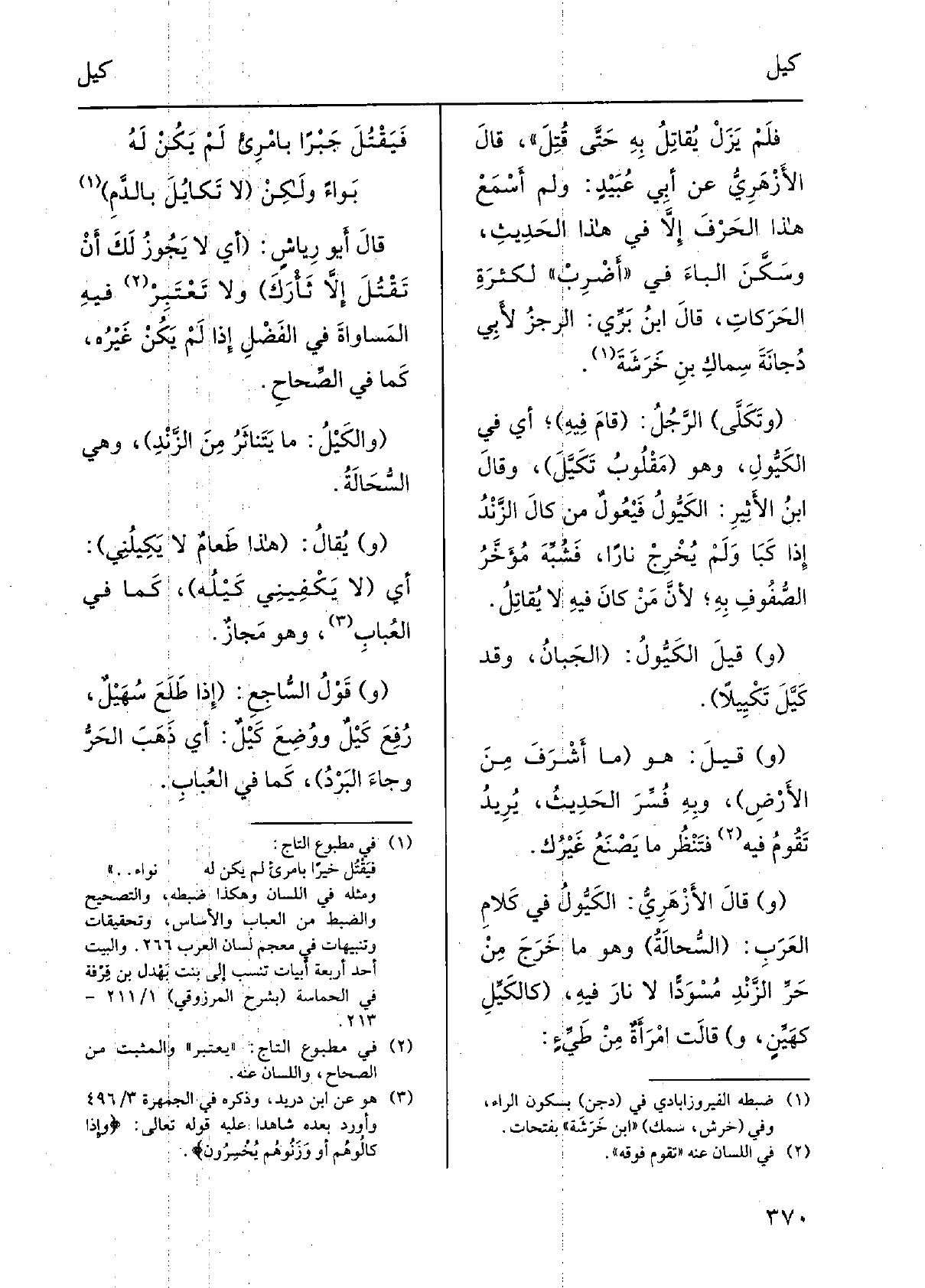 قَالَ أَبُو رِياشٍ: أَي لَا يجوزُ لكَ أَن تَقْتُلَ إلاّ ثَأْرَكَ وَلَا تَعْتَبرْ فِيهِ المَساواةَ فِي الفَضْلِ إِذا لم يكن غَيْرُه، كَمَا فِي الصِّحاح. {والكَيْل: مَا يَتَنَاثَرُ من الزَّند، وَهِي السُّحالَة. يُقَال: هَذَا طعامٌ لَا} يَكيلُني: أَي لَا يَكفيني! كَيْلُه، كَمَا فِي العُباب، وَهُوَ مَجاز. قَوْلُ الساجِع: إِذا طَلَعَ سُهَيْلٌ، رُفِعَ كَيْلٌ ووُضِعَ كَيْلٌ: أَي ذَهَبَ الحَرُّ وجاءَ البَردُ، كَمَا فِي العُباب.