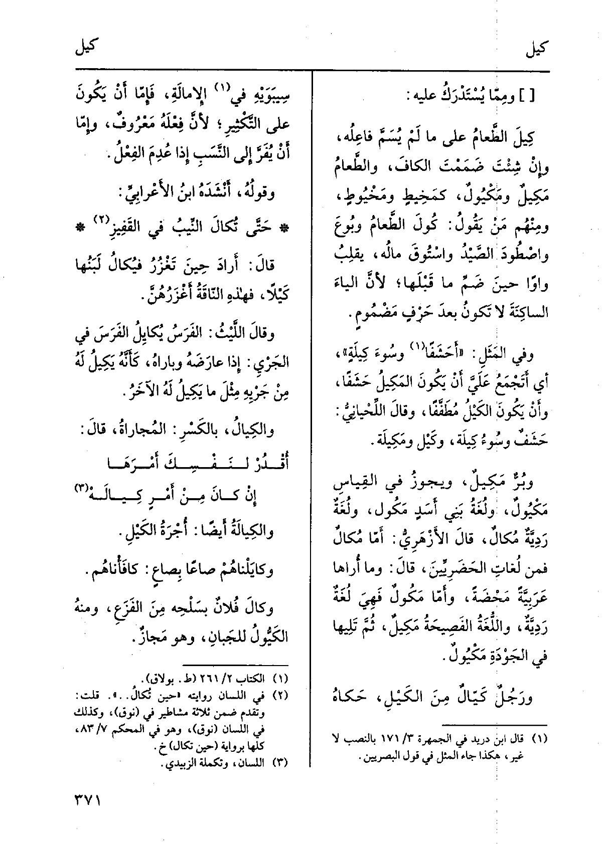 وَمِنْهُم من يَقُول:} كُولَ الطعامُ وبُوعَ واصْطُودَ الصَّيْدُ واسْتُوقَ مالُه، يقلِبُ واواً حِين ضَمِّ مَا قَبْلَها لأنّ الياءَ الساكنةَ لَا تكونُ بعدَ حرفٍ مَضْمُومٍ. وَفِي المثَل: أَحَشَفاً وسُوءَ {كِيلَةٍ، أَي أَتَجْمعُ عليَّ أَن يكونَ} المَكيلُ حَشَفَاً، وَأَن يكونَ {الكَيْلُ مُطَفَّفاً، وَقَالَ اللِّحْيانِيّ: حَشَفٌ وسُوءُ كِيلَة، وَكَيْل ومَكيلَة. وبُرٌّ} مَكيلٌ، ويجوزُ فِي القياسِ {مَكْيُولٌ، ولغةُ بني أسَدٍ} مَكُول، ولغةٌ رَدِيَّةٌ {مُكالٌ، قَالَ الأَزْهَرِيّ: أمّا مُكالٌ فَمن لُغاتِ الحَضَرِيِّينَ، قَالَ: وَمَا أُراها عربيّةً مَحْضَةً، وأمّا مَكيلٌ، ثمّ تَليها فِي الجَوْدَةِ مَكْيُولٌ. ورجلٌ} كَيّالٌ من الكَيْل، حَكَاهُ سيبويهِ فِي الإمالَةِ، فإمّا أَن يكونَ على التكثيرِ لأنّ فِعلَه مَعْرُوفٌ، وإمّا أَن يُفَرَّ إِلَى النَّسَبِ إِذا عُدِمَ الفِعلُ. وقولُه، أنْشدهُ ابْن الأَعْرابِيّ: حَتَّى {تُكالَ النِّيبُ فِي القَفيزِ قَالَ: أرادَ حِين تَغْزُرُ} فيُكالُ لبَنُها كَيْلاً، فَهَذِهِ الناقةُ أَغْزَرُهُنَّ. وَقَالَ الليثُ: الفرَسُ {يُكايِلُ الفرَسَ فِي الجَرْيِ: إِذا عارضَه وباراه، كأنّه} يَكيلُ لَهُ من جَرْيِه مِثلَ مَا يَكيلُ لَهُ الآخَرُ. {والكِيال، بالكَسْر: المُجاراةُ، قَالَ: