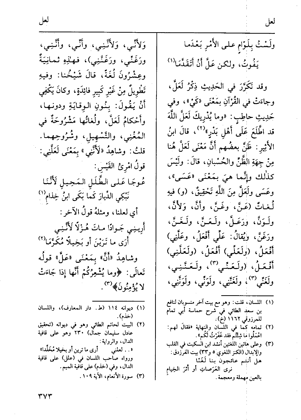 وَقد تكرَّرَ فِي الحديثِ ذِكرُ لَعَلَّ، وجاءتْ فِي القرآنِ بِمَعْنى كَيْ، وَفِي حديثِ حاطِبٍ: وَمَا يُدريكَ لَعَلَّ اللهَ قد اطَّلَعَ على أهلِ بَدرٍ، قَالَ ابنُ الْأَثِير: ظنَّ بعضُهم أنّ معنى لَعَلَّ هُنَا من جهةِ الظنِّ والحُسْبان، قَالَ: وَلَيْسَ كَذَلِك وإنّما هِيَ بِمَعْنى عَسَى، وَعَسَى ولَعَلَّ من اللهِ تَحقيقٌ، فِيهِ لُغاتٌ: عَنَّ، وغَنَّ، وأنَّ، ولأَنَّ، ولَوَنَّ، ورَعَلَّ، ولَعَنَّ، ولَغَنَّ، ورَغَنَّ، وَيُقَال: علِّيَّ أَفْعَلُ، وعَلَّني أَفْعَلُ، ولَعَلِّي أَفْعَلُ، وَلَعَلَّني أَفْعَل، وَلَعَنِّي، وَلَعَنَّنِي وَلَغَنِّي، وَلَغَنَّنِي، وَلَوَنِّي، وَلَوَنَّنِي، ولأَنِّي، ولأنَّنِي، وأنِّي، وأنَّني، ورَغَنِّي، وَرَغَنَّني، فَهَذِهِ ثمانيةٌ وعشرونَ لُغَة، قَالَ شيخُنا: وَفِيه تَطْوُيلٌ من غيرِ كبيرِ فائدةٍ، وَكَانَ يَكْفِي أَن يَقُول: بنوِ الوِقايةِ ودونها، وأحكامُ لَعَلَّ، ولُغاتُها مَشْرُوحةٌ فِي المُغْني، والتَّسْهيل، وشُروحُهما. قلتُ: وشاهدُ لأَنَّنِي بِمَعْنى لَعَلَّني: من قولِ امرئِ القَيس:)