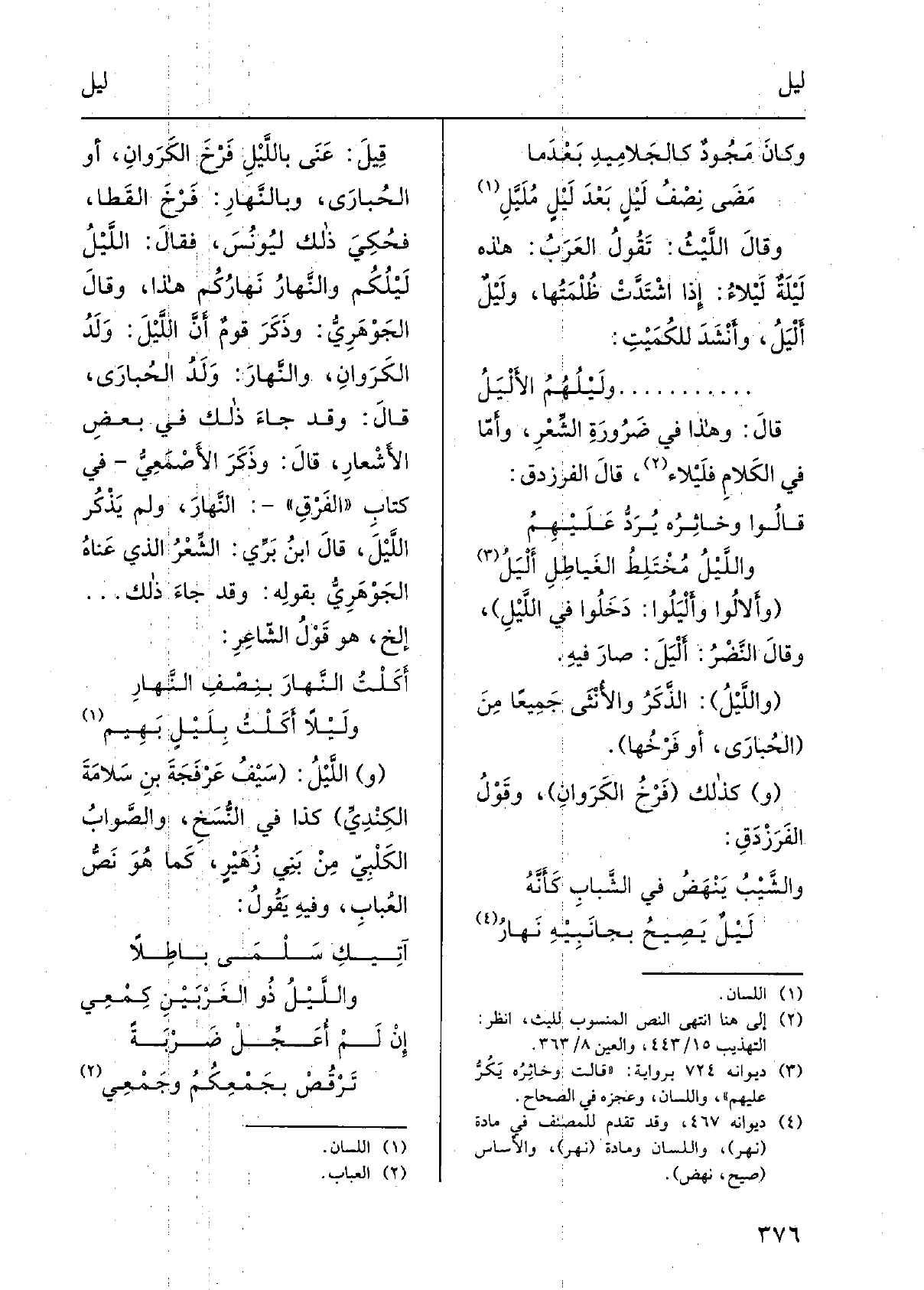 وَقَالَ الليثُ: تقولُ العربُ: هَذِه لَيْلَةٌ لَيْلاء: إِذا اشتدَّتْ ظُلمَتُها، وَلَيْلٌ أَلْيَلٌ، وأنشدَ للكُمَيْت: ... ... وَلَيْلُهُمُ {الأَلْيَلُ قَالَ: وَهَذَا فِي ضرورةِ الشِّعرِ، وأمّا فِي الكلامِ فَلَيْلاء، قَالَ الفرَزْدقُ: