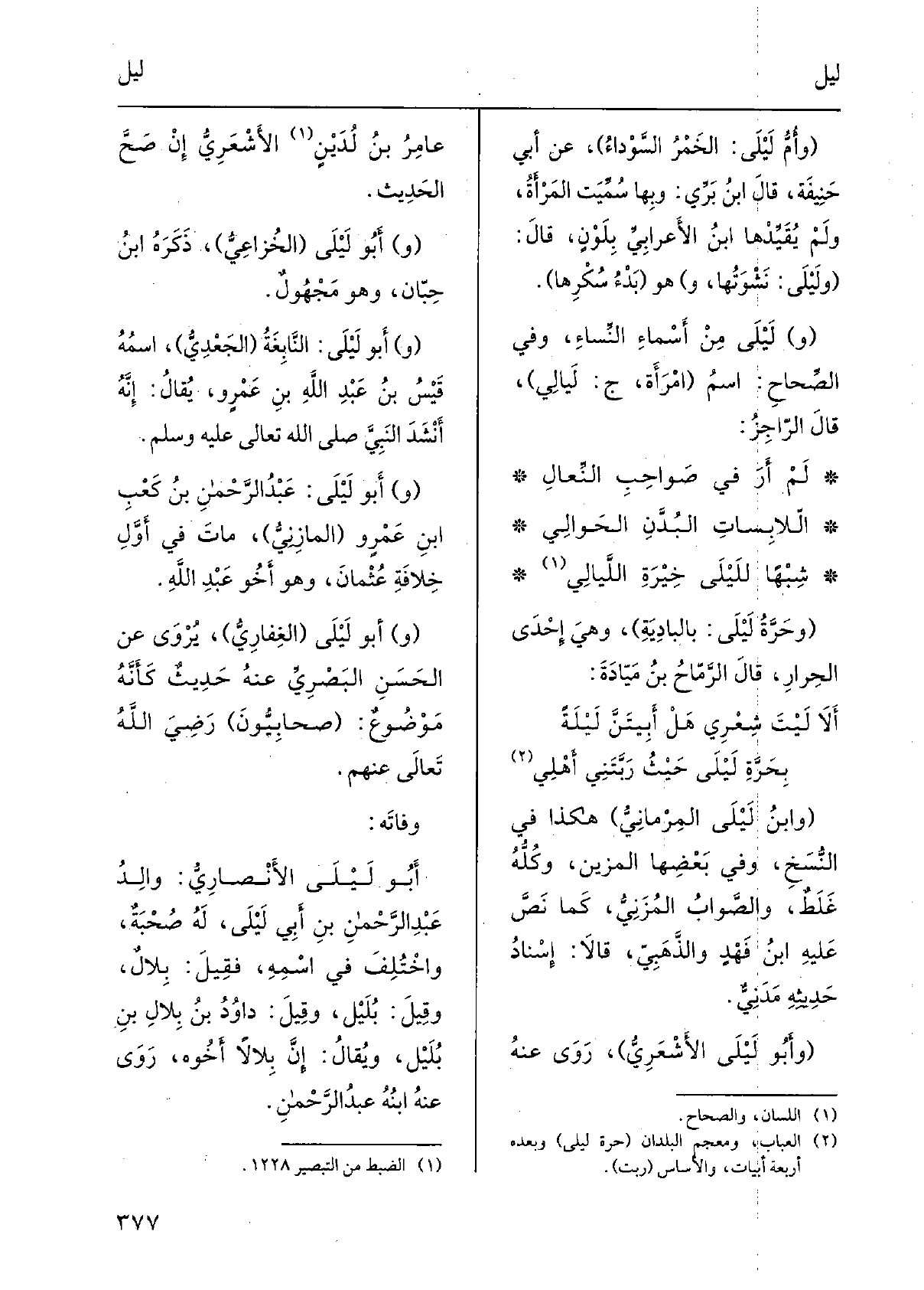 وسلَّم. أَبُو لَيْلَى: عَبْدُ الرحمنِ بنُ كَعْبِ بنِ عمروٍ المازِنيُّ، ماتَ فِي أوّلِ خِلافَةِ عثمانَ، وَهُوَ أَخُو عَبْد الله. أَبُو لَيْلَى الغِفاريُّ، يُروى عَن الحسَنِ البَصريِّ عَنهُ حديثٌ كأنّه مَوْضُوعٌ: صَحابِيّون رَضِيَ الله تَعالى عَنْهُم. وفاتَه: أَبُو لَيْلَى الأنْصاريّ: والِدُ عبدِ الرحمنِ بن أبي لَيْلَى، لَهُ صُحبَةٌ، واختُلفَ فِي اسمِه، فَقيل: بِلالٌ، وَقيل: بُلَيْل، وَقيل: داودُ بنُ بِلالِ بن بُلَيْل، وَيُقَال: إنّ بِلالاً أَخُوهُ، روى عَنهُ ابنُه عبدُ الرَّحْمَن.