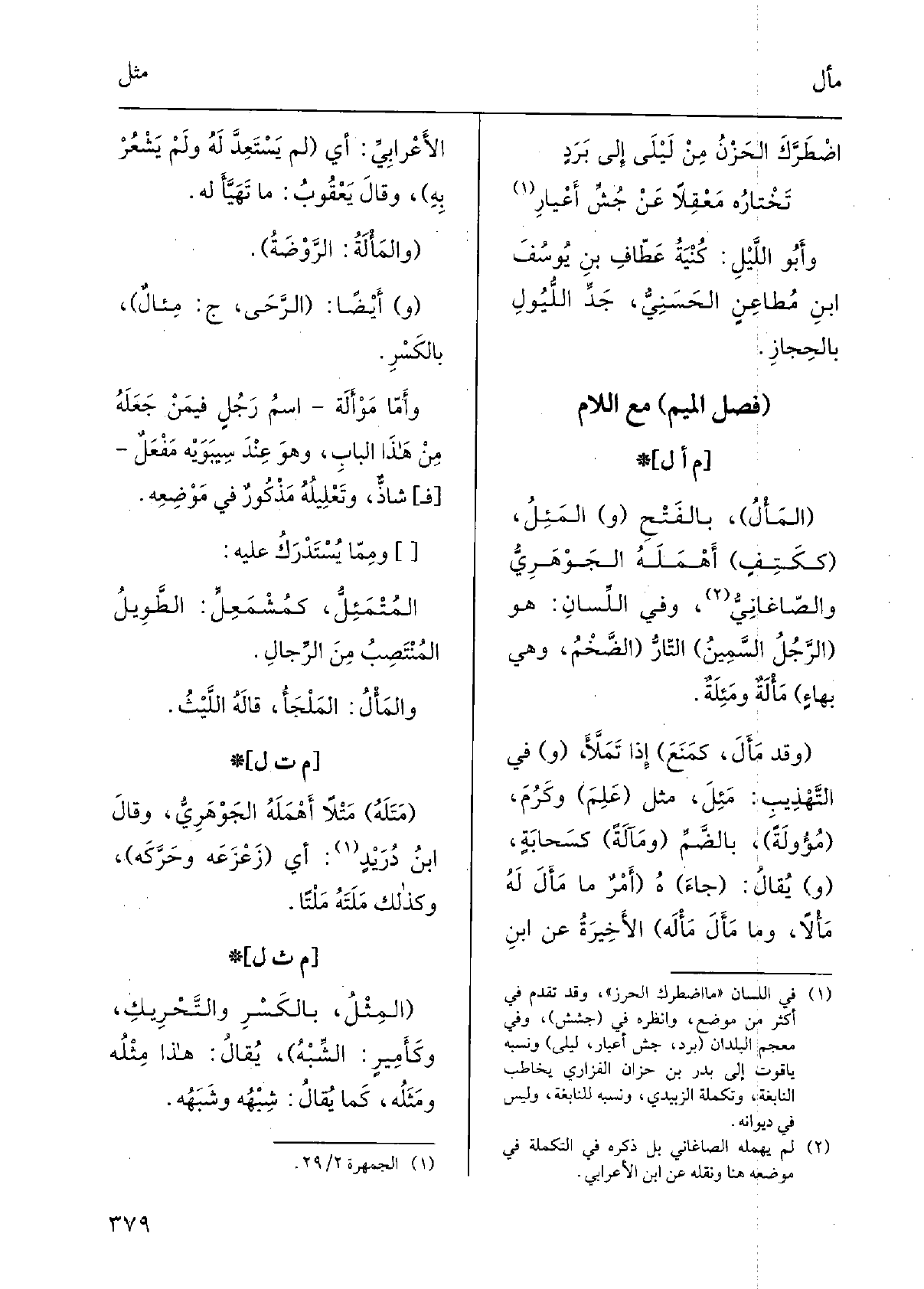 أَيْضا: الرَّحى، ج: {مِئالٌ، بالكَسْر. وأمّا} مَوْأَلَ اسمُ رجلٍ فيمَن جَعَلَه من هَذَا الْبَاب، وَهُوَ عِنْد سِيبَوَيْهٍ مَفْعَلٌ فشاذٌّ، وتَعليلُه مذكورٌ فِي مَوْضِعه. ومِمّا يُسْتَدْرَك عَلَيْهِ: {المُتْمَئِلُّ، كمُشْمَعِلٍّ: الطويلُ المُنتَصِبُ من الرِّجال.} والمَأْل: الملجأ، قَالَه اللَّيْث.