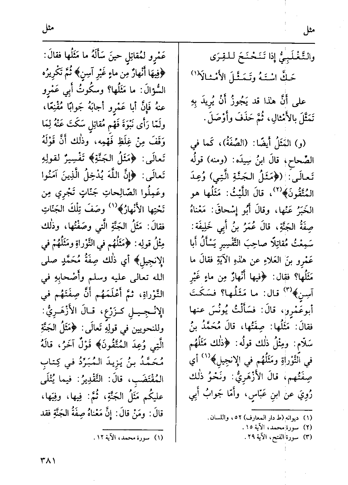 على أنّ هَذَا قد يجوزُ أَن يريدَ بِهِ تمَثَّلَ بالأَمْثالِ، ثمّ حَذَفَ وأَوْصَلَ. المَثَلُ أَيْضا: الصِّفة، كَمَا فِي الصِّحاح، قَالَ ابنُ سِيدَه: وَمِنْه قَوْله تَعالى: مَثَلُ الجنَّةِ الَّتِي وُعِدَ المُتَّقون، قَالَ الليثُ: مثَلُها هُوَ الخبَرُ عَنْهَا، وَقَالَ أَبُو إِسْحَاق: معناهُ صِفةُ الجنّةِ، قَالَ عُمرُ بنُ أبي حَنيفة: سَمِعْتُ مُقاتِلاً صاحبَ التفسيرِ يَسْأَلُ أَبَا عَمْرِو بنَ العلاءِ عَن هَذِه الآيةَ فقالَ مَا مثَلُها فَقَالَ: فِيهَا أَنْهَارٌ من ماءٍ غيرِ آسِنٍ قَالَ: مَا مَثَلُها فَسَكَتَ أَبُو عمروٍ، قَالَ: فَسَأَلتُ يونُسَ عَنْهَا فَقَالَ: مَثَلُها: صِفَتُها، قَالَ مُحَمَّد بن سَلاّمٍ: ومِثْلُ ذَلِك قولُه: ذَلِك مثَلُهم فِي التَّوراةِ وَمَثَلُهم فِي الْإِنْجِيل أَي صِفتُهم، قَالَ الأَزْهَرِيّ: ونحوُ ذَلِك رُوِيَ عَن ابنِ عبّاسٍ، وأمّا جوابُ أبي عمروٍ حينَ سألَه مَا مثَلُها فَقَالَ: فِيهَا أَنْهَارٌ من ماءٍ غيرِ آسِنٍ ثمّ تَكْرِيرُه السُّؤال: مَا مثَلُها وسُكوتُ أبي عمروٍ عَنهُ فإنّ أَبَا عمروٍ أَجَابَهُ جَوَابا مُقنِعاً، ولمّا رأى نَبْوَةَ فَهْمِ مُقاتِلٍ سَكَتَ عَنهُ لِما وَقَفَ من غِلَظِ فَهْمِه، وَذَلِكَ أنّ قَوْله تَعالى: مَثَلُ الجنَّة تَفْسِيرٌ لقولِه تَعَالَى: إنّ اللهَ يُدخِلُ الذينَ آمنُوا وعَمِلوا الصالِحاتِ جَنّاتٍ تجْرِي من تَحْتِها الْأَنْهَار وَصَفَ تلكَ الجنّاتِ فَقَالَ: مثَلُ الجنَّةِ الَّتِي وَصَفْتُها، وَذَلِكَ مِثلُ قولِه: مثَلُهُم فِي التَّوراةِ ومثَلُهم فِي الْإِنْجِيل أَي ذَلِك صِفةُ مُحَمَّد صلّى الله تَعَالَى عَلَيْهِ وسلَّم وأصحابِه فِي التَّوْراة، ثمّ أعلمَهُم أنّ صِفتَهم فِي الإنجيلِ كَزَرْعٍ، قَالَ الأَزْهَرِيّ: وللنحويين فِي قَوْله تَعالى: مثَلُ الجنّةِ الَّتِي وُعِدَ المُتَّقون قولٌ آخَرُ، قَالَه مُحَمَّد بن يَزيدَ المُبَرِّدَ فِي كتابِ المُقْتَضَبِ، قَالَ: التقديرُ: فِيمَا يُتلى عليكُم مثَلُ الجنّةِ، ثمّ: فِيهَا، وفيهَا، قَالَ: وَمَنْ قالَ: إنّ مَعْنَاهُ صِفةُ الجنّةِ فقد