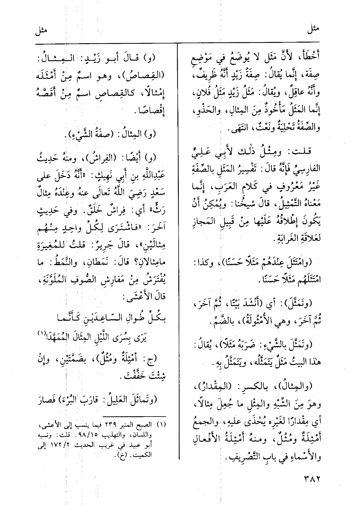 ج: أَمْثِلَةٌ ومثُلٌ، بضمَّتَيْن، وإنْ شِئتَ خَفَّفْت. وتماثَلَ العَليلُ: قارَبَ البُرْءَ فصارَ