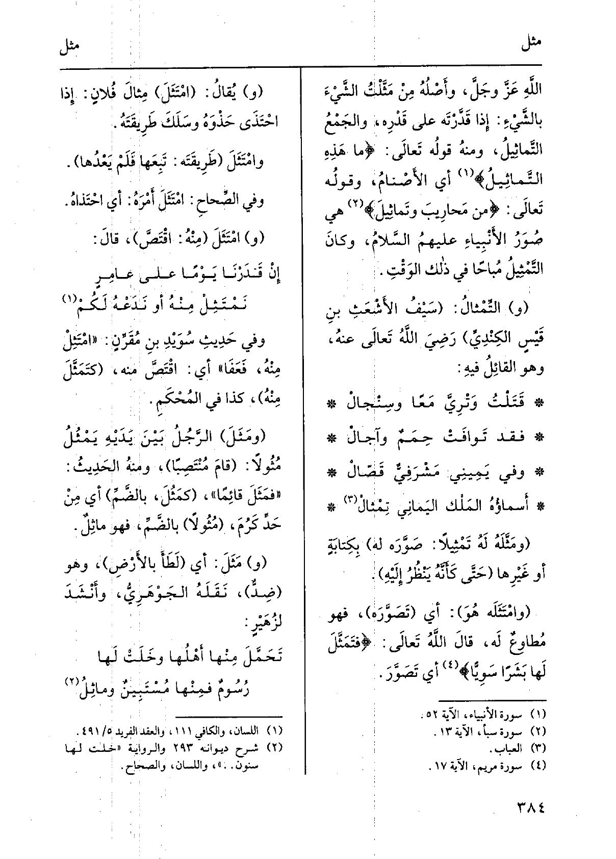 اللهِ عزَّ وجلَّ، وأصلُه من مَثَّلْتُ الشيءَ بالشيءِ: إِذا قَدَّرْتَه على قَدْرِه، والجمعُ التَّماثيل، وَمِنْه قَوْله تَعالى: مَا هَذِه)
