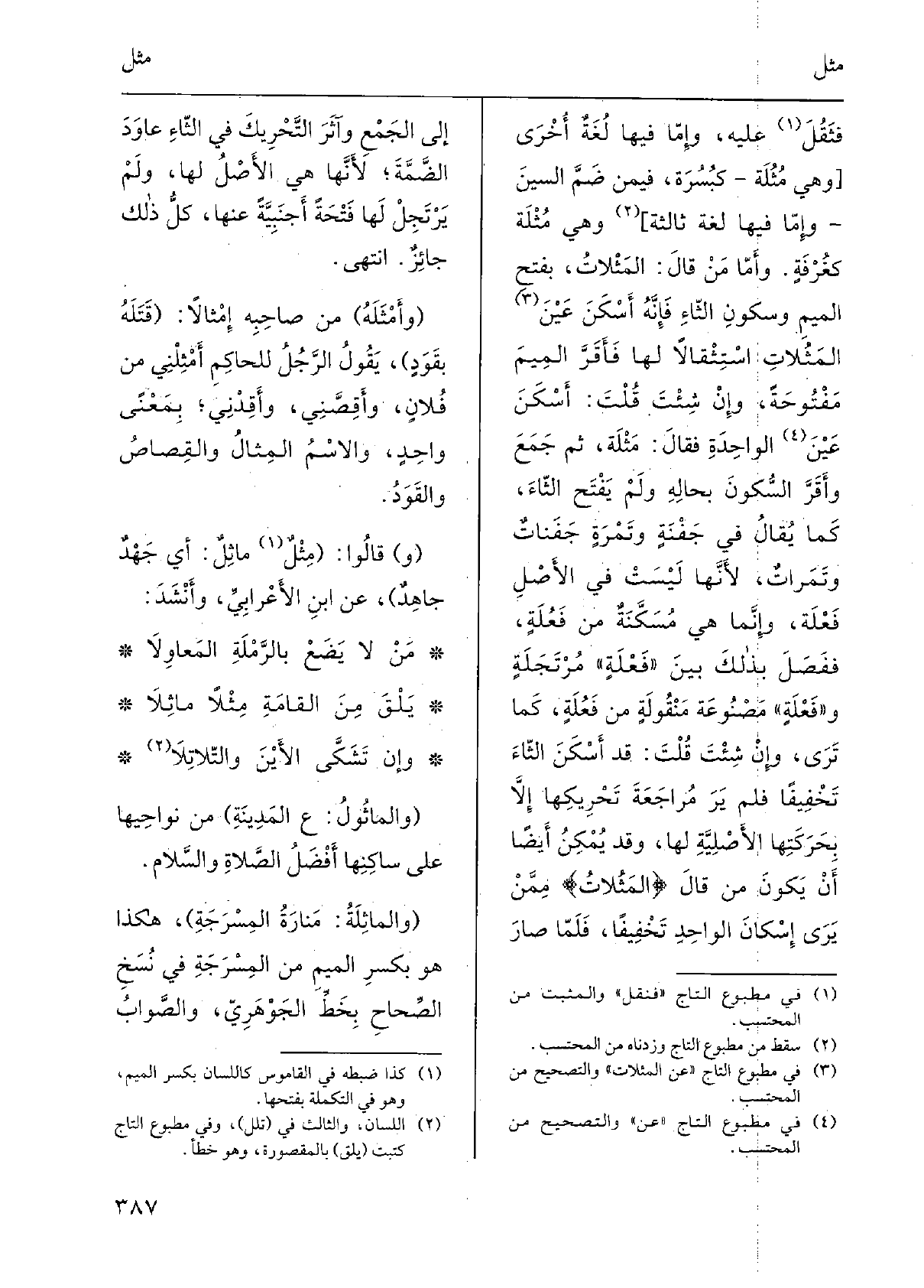 فثَقُلَ عَلَيْهِ، وإمّا فِيهَا لغةٌ أُخرى وَهِي مُثُلَة كبُسُرَة، فِيمَن ضمَّ السينَ وإمّا فِيهَا لغةٌ ثالثةٌ وَهِي مُثْلَة كغُرْفَةٍ. وأمّا من قَالَ: المَثْلات، بفتحِ الميمِ وسكونِ الثاءِ فإنّه أَسْكَنَ عَيْنَ المَثُلاتِ اسْتِثقالاً لَهَا فَأَقَرَّ الميمَ مَفْتُوحةً، وَإِن شِئتَ قلتَ: أَسْكَنَ عَيْنَ الواحدةَ فَقَالَ:) مَثْلَة، ثمّ جَمَعَ وأقرَّ السكونَ بحالِه وَلم يَفْتَحْ الثاءَ، كَمَا يُقَال فِي جَفْنَةٍ وتَمْرَةٍ جَفَنَاتٌ وتَمَرَاتٌ، لأنّها ليستْ فِي الأصلِ فَعْلَة، وإنّما هِيَ مُسَكَّنةٌ من فَعُلَةٍ، فَفَصَل بذلك بَين فَعْلَةٍ مُرتَجِلَةٍ وفَعْلَةٍ مصنوعة مَنْقُولةٍ من فَعُلَةٍ، كَمَا ترى، وَإِن شِئتَ قلتَ: قد أَسْكَنَ الثاءَ تَخْفِيفًا فَلم يرَ مُراجعةَ تحريكِها إلاّ بحركَتِها الأصليّةِ لَهَا، وَقد يُمكنُ أَيْضا أَن يكونَ من قَالَ: المَثُلات ممّن يرى إسْكانَ الواحدِ تَخْفِيفًا، فلمّا صارَ إِلَى الجمعِ وآثَرَ التحريكَ فِي الثاءِ عاوَدَ الضمّةَ لأنّها هِيَ الأصلُ لَهَا، وَلم يَرْتَجِلْ لَهَا فَتْحَةً أَجْنَبيّةً عَنْهَا، كلُّ ذَلِك جائزٌ، انْتهى. وأَمْثَلَه من صاحبِه إمْثالاً: قَتَلَه بقَوَدٍ، يقولُ الرجلُ للحاكمِ أَمْثِلْني من فلانٍ، وأَقِصَّني، وأَقِدْني، بِمَعْنى واحدٍ، والاسمُ المِثالُ والقِصاصُ والقَوْدُ. قَالُوا: مِثْلٌ ماثِلٌ: أَي جَهدٌ جاهِدٌ، عَن ابْن الأَعْرابِيّ، وَأنْشد: مَن لَا يَضَعْ بالرَّمْلَةِ المَعاوِلا يَلْقَ منَ القامةِ مِثْلاً ماثِلا وَإِن تشَكَّى الأَيْنَ والتّلاتِلا والماثُول: ع بالمدينةِ من نَوَاحِيهَا على ساكنِها أفضلُ الصلاةِ وَالسَّلَام. والماثِلَة: مَنارةُ المِسْرَجةِ، هَكَذَا هُوَ بكسرِ الميمِ من المِسْرَجَةِ فِي نسخِ الصِّحاح بخطِّ الجَوْهَرِيّ، والصوابُ