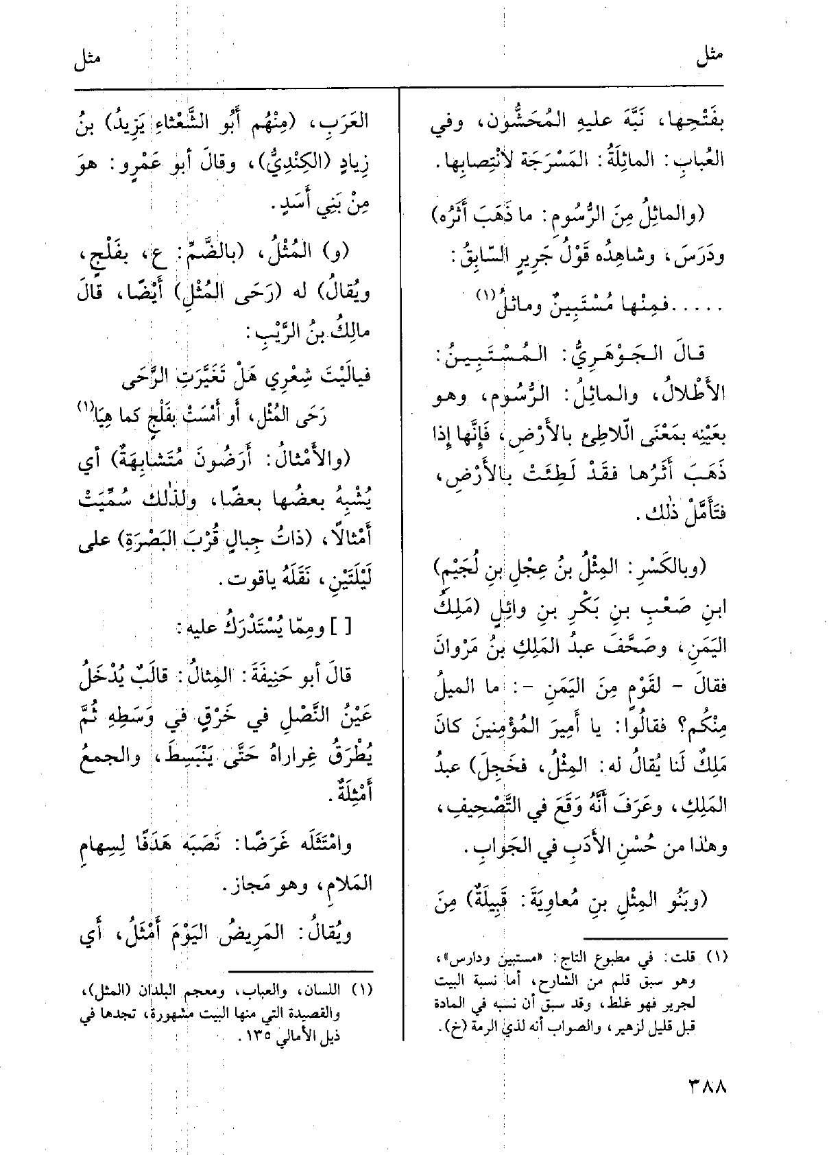 بفتحِها، نبَّه عَلَيْهِ المُحَشُّون، وَفِي العُباب: الماثِلَة: المَسْرَجةُ لانتِصابِها. والماثِلُ من الرُّسوم: مَا ذَهَبَ أثَرُه وَدَرَسَ، وشاهدُه قَوْلُ جَريرٍ السَّابِق: ... . فمِنها مُسْتَبينٌ وماثِلُ قَالَ الجَوْهَرِيّ: المُستَبين: الأَطْلال، والماثِل: الرُّسوم، وَهُوَ بعَينِه بِمَعْنى اللاطِئ بالأرضِ، فإنّها إِذا ذَهَبَ أثَرُها فقد لَطِئَتْ بالأرضِ، فتأمَّلْ ذَلِك. وبالكَسْر: المِثْلُ بنُ عِجْلِ بنِ لُجَيْمِ بنِ صَعْبِ بن بَكْرِ بنِ وائلٍ مَلِكُ الْيمن، وصَحَّفَ عبدُ الملِكِ بنُ مَرْوَانَ فَقَالَ لقومٍ من الْيمن: مَا الميلُ مِنْكُم فَقَالُوا: يَا أميرَ المُؤمنين كانَ ملِكٌ لنا يُقَال لَهُ: المِثْلُ، فخَجِلَ عبدُ الملِك، وعرفَ أنّه وَقَعَ فِي التَّصحيف، وَهَذَا من حُسنِ الأدَبِ فِي الجَواب. وبَنو المِثْلِ بنِ مُعاوِيَة: قبيلةٌ من العربِ، مِنْهُم أَبُو الشَّعْثاءِ يزيدُ بنُ زيادٍ الكِنْديُّ، وَقَالَ أَبُو عمروٍ: هُوَ من بني أسَدٍ. المُثْل، بالضَّمّ: ع، بفَلْجٍ، وَيُقَال لَهُ رَحى المُثْلِ أَيْضا، قَالَ مالكُ بنُ الرَّيْب: