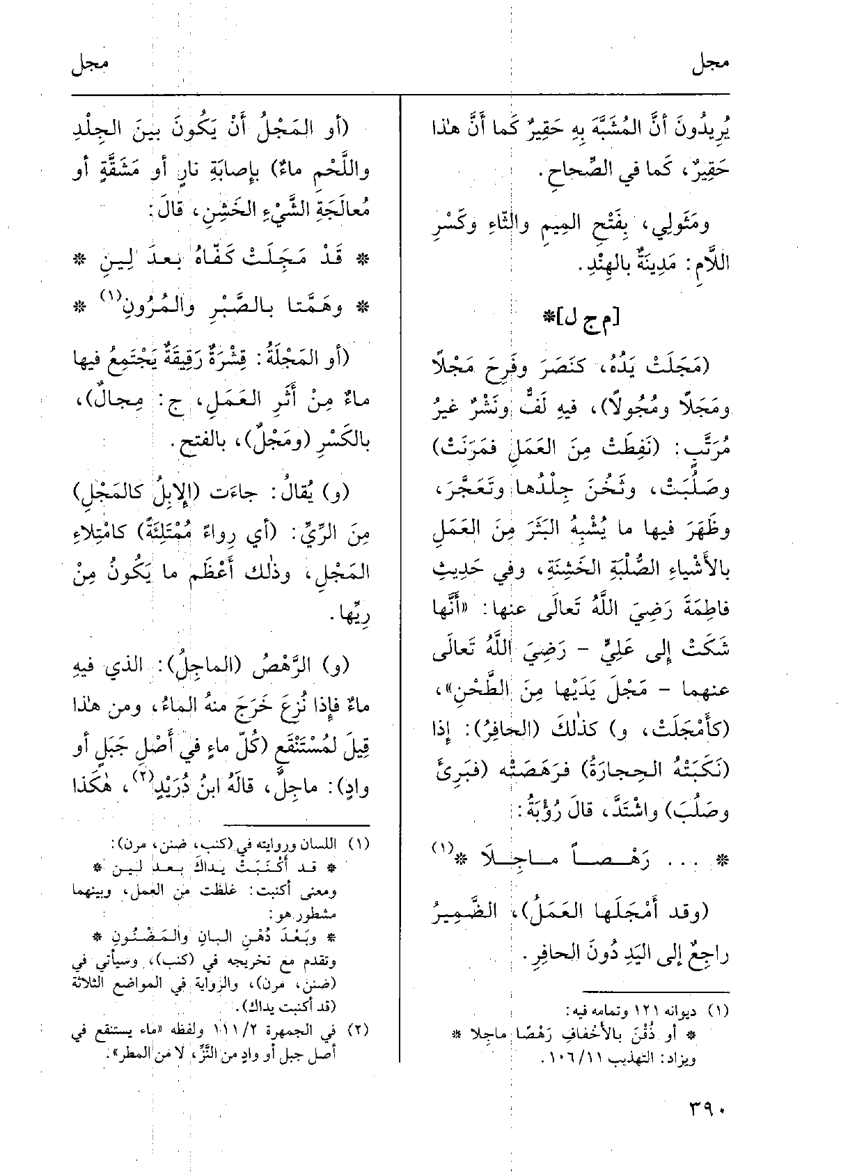 مَجَلَتْ يدُه، كَنَصَرَ وفَرِحَ مَجْلاً وَمَجَلاً ومُجولاً، فِيهِ لَفٌّ وَنَشْر غيُ مُرَتَّبٍ: نَفِطَتْ من العملِ فَمَرَنتْ وصَلُبَتْ، وثَخُنَ جِلدُها وَتَعَجَّرَ، وَظَهَرَ فِيهَا مَا يُشبهُ البَثَرَ من العملِ بالأشياءِ الصُّلبةِ الخَشِنةِ، وَفِي حديثِ فاطِمةَ رَضِيَ الله تَعالى عَنْهَا: أنّها شَكَتْ إِلَى عليٍّ رَضِيَ الله تَعالى عَنْهُمَا مَجْلَ يَدَيْها من الطَّحْن، كَأَمْجلَتْ، وَكَذَلِكَ الحافِرُ: إِذا نَكَبَتْه الحجارةُ فَرَهَصتْه فبَرِئَ وصَلُبَ واشْتدَّ، قَالَ رُؤبةُ: ... . رَهْصَاً ماجِلا وَقد أَمْجَلَها العملُ، الضميرُ راجعٌ إِلَى اليدِ دونَ الحافِرِ. أَو المَجْلُ أَن يكونَ بَين الجِلدِ واللحمِ ماءٌ بإصابةِ نارٍ أَو مشَقَّةٍ أَو مُعالجةُ الشيءِ الخَشِن، قَالَ: قد مَجِلَتْ كَفّاهُ بعدَ لِينِ وهَمَّتا بالصَّبرِ والمُرونِ أَو المَجْلَة: قِشرةٌ رقيقةٌ يَجْتَمِعُ فِيهَا ماءٌ من أثَرِ العملِ، ج: مِجالٌ، بالكَسْر وَمَجْلٌ، بالفَتْح. يُقَال: جَاءَت الإبلُ كالمَجْلِ من الرَّيِّ: أَي رِواءً مُمتلِئةً كامتِلاءِ المَجْلِ، وَذَلِكَ اَعْظَمُ مَا يكونُ منْ رِيِّها. الرَّهْصُ الماجِل: الَّذِي فِيهِ ماءٌ فَإِذا نُزِعَ خَرَجَ مِنْهُ الماءُ، وَمن هَذَا قيل للمُستنْقَعِ كلّ ماءٍ فِي أصلِ جبلٍ أَو وادٍ: ماجِلٌ، قَالَه ابْن دُرَيْدٍ، هَكَذَا