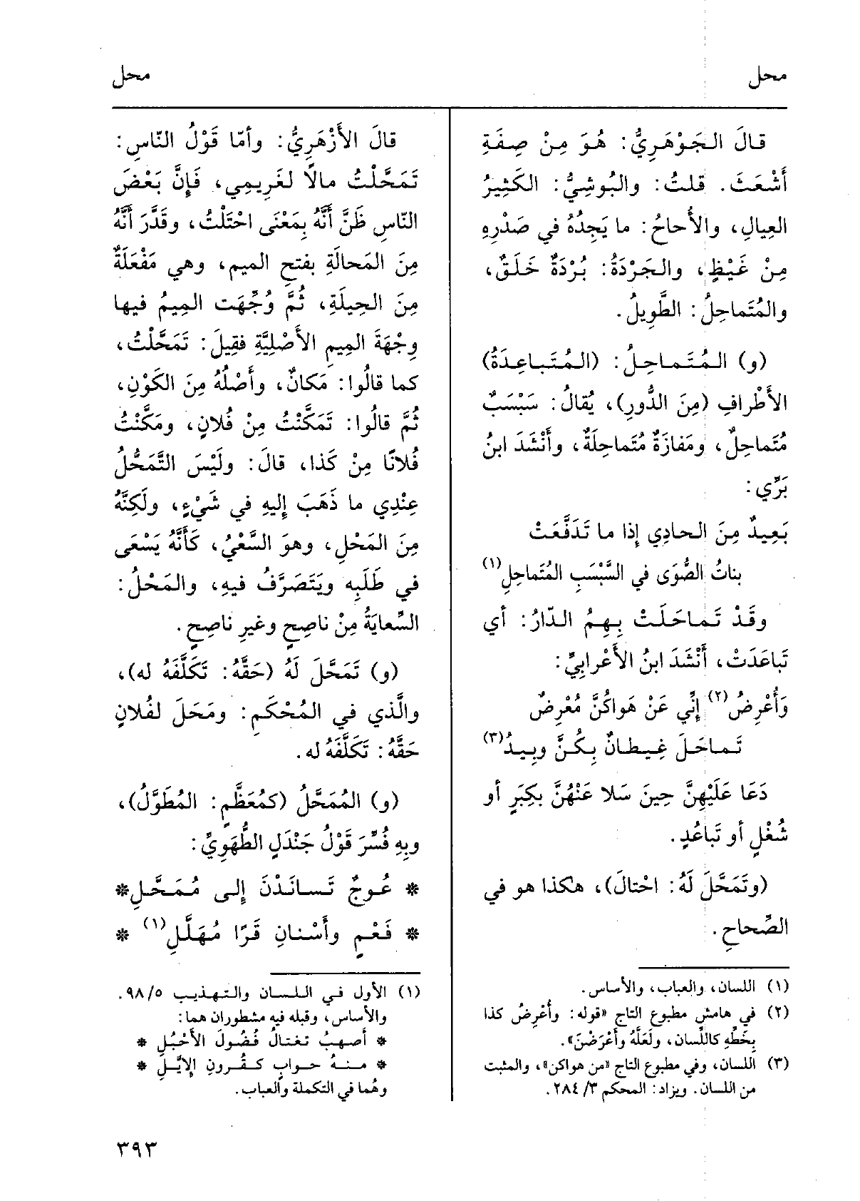 قَالَ الأَزْهَرِيّ: وأمّا قولُ النَّاس: تمَحَّلْتُ مَالا لغَريمي، فإنّ بعضَ الناسِ ظنَّ أنّه بِمَعْنى احْتَلْتُ، وقدَّرَ أنّه من المَحالَةِ بفتحِ الْمِيم، وَهِي مَفْعَلةٌ من الحِيلَة، ثمّ وُجِّهَت الميمُ فِيهَا وِجهةَ الميمِ الأصليّةِ فَقيل: تمَحَّلْتُ، كَمَا قَالُوا: مكانٌ، وأصلُه من الكَوْن، ثمّ قَالُوا: تمَكَّنْتُ من فلانٍ، ومَكَّنْتُ فلَانا من كَذَا، قَالَ: وليسَ التَّمْحُّلُ عِنْدِي مَا ذهبَ إِلَيْهِ فِي شيءٍ، ولكنّه من المَحْل، وَهُوَ السعيُ، كأنّه يسْعَى فِي طلَبِه ويتصَرَّفُ فِيهِ، والمَحْل: السِّعايَةُ من ناصحٍ وغيرِ ناصحٍ. تمَحَّلَ لَهُ حَقَّه: تكَلَّفَه لَهُ، وَالَّذِي فِي المُحْكَم: وَمَحَلَ لفلانٍ حقَّه: تكلَّفَه لَهُ. المُمَحَّل، كمُعَظَّمٍ: المُطَوَّلُ، وَبِه فُسِّرَ قَوْلُ جَنْدَلٍ الطُّهَوِيّ: عُوجٌ تَسانَدْنَ إِلَى مُمَحَّلِ فَعْمٍ وأَسْنانِ قَراً مُهَلَّلِ