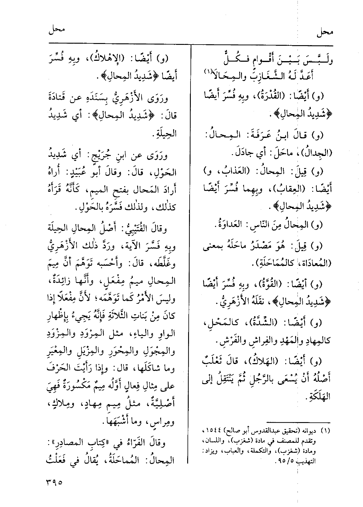 أَيْضا: الهَلاك، قَالَ ثعلبٌ أصلُه أنْ يُسعى بالرجلِ ثمّ يَنْتَقلُ إِلَى الهلَكَة. أَيْضا: الإهلاك، وَبِه فُسِّرَ أَيْضا: شديدُ المِحال. وروى الأَزْهَرِيّ بسَنَدِه عَن قَتادَةَ قَالَ: شديدُ المِحال: أَي شديدُ الحِيلَة. وروى عَن ابنِ جُرَيْجٍ: أَي شديدُ الحَوْل، قَالَ: وَقَالَ أَبُو عُبَيْدٍ: أُراهُ أرادَ المَحالِ بفتحِ الْمِيم، كأنّه قَرَأَه كَذَلِك، وَلذَلِك فسَّرَه بالحَوْل. وَقَالَ القُتَيْبيّ: أصلُ المِحالِ الحِيلَةِ وَبِه فسَّرَ الْآيَة، ورَدَّ ذَلِك الأَزْهَرِيّ وغلَّطَه، قَالَ: وأحسَبه توهَّمَ أنّ ميمَ المِحالِ ميمُ مِفْعَل، وأنّها زائدةٌ، وليسَ الأمرُ كَمَا توهَّمَه لأنّ مِفْعَلاً إِذا كانَ من بناتِ الثلاثةِ فإنّه يجيءُ بإظهارِ الواوِ وَالْيَاء، مثل المِرْوَدِ والمِزْوَدِ والمِجْوَلِ والمِحْوَرِ والمِزْيَلِ والمِعْيَرِ وَمَا شاكَلَها، قَالَ: وَإِذا رَأَيْتَ الحرفَ على مثالِ فِعالٍ أوّلُه ميمٌ مَكْسُورةٌ فَهِيَ أصليّةٌ، مثلُ ميمِ مِهادٍ، ومِلاكٍ، ومِراسٍ، وَمَا أَشْبَهها. وَقَالَ الفَرّاءُ فِي كتابِ المصادر: المِحال: المُماحَلَة، يُقَال فِي فَعَلْتُ