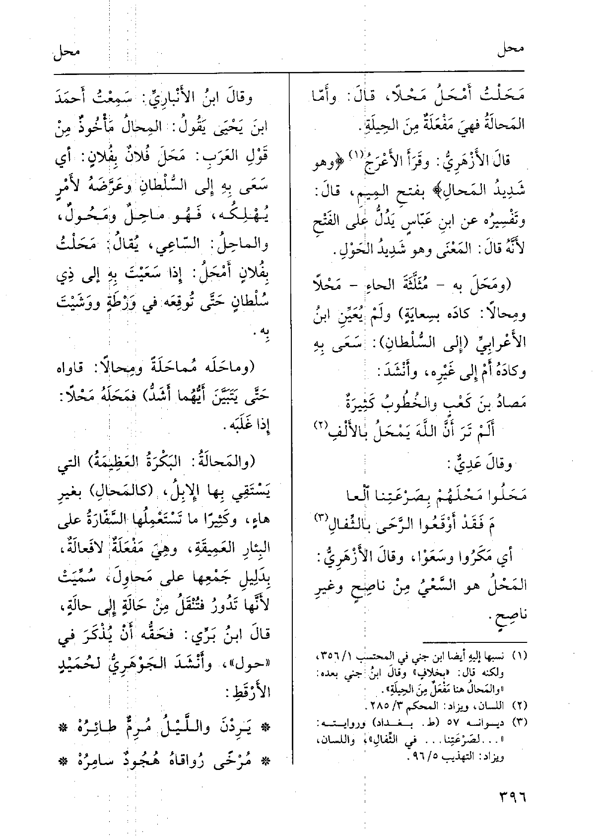أَي مكَروا وَسَعَوا، وَقَالَ الأَزْهَرِيّ: المَحْلُ هُوَ السعْيُ من ناصِحٍ وغيرِ ناصحٍ. وَقَالَ ابنُ الأَنْباريّ: سَمِعْتُ أحمدَ بن يَحْيَى يَقُول: المِحال مأخوذٌ من قولِ الْعَرَب: مَحَلَ فلانٌ بفلانٍ: أَي سعى بِهِ إِلَى السُّلْطَان وعرَّضَه لأمرٍ يُهلِكُه، فَهُوَ ماحِلٌ ومَحُولٌ، والماحِل: السَّاعِي، يُقَال:) مَحَلْتُ بفلانٍ أَمْحَل: إِذا سَعَيْتَ بِهِ إِلَى ذِي سُلطانٍ حَتَّى تُوقِعَه فِي وَرْطَةٍ وَوَشَيْتَ بِهِ. وماحَلَه مُماحَلةً ومِحالاً: قاواه حَتَّى يتبيَّنَ أيُّهما أشَدُّ فَمَحَله مَحْلاً: إِذا غَلَبَه. والمَحالَة: البَكْرَةُ العظيمةُ الَّتِي يَسْتَقي بهَا الإبلُ، كالمَحالِ بغيرِ هاءٍ، وَكَثِيرًا مَا تَسْتَعملُها السَّفّارَةُ على البِئارِ العميقة، وَهِي مَفْعَلةٌ لَا فَعالَةٌ، بدَليلِ جَمْعِها على مَحاوِلَ، سُمِّيَتْ لأنّها تدورُ فتنْقُلُ من حالةٍ إِلَى حالةٍ، قَالَ ابنُ بَرِّي: فحقُّه أَن يُذكَرَ فِي حول، وأنشدَ الجَوْهَرِيّ لحُمَيْدٍ الأرْقَط: يَرِدْنَ والليلُ مُرِمٌّ طائِرُهْ مُرْخىً رُواقاهُ هُجودٌ سامِرُهْ