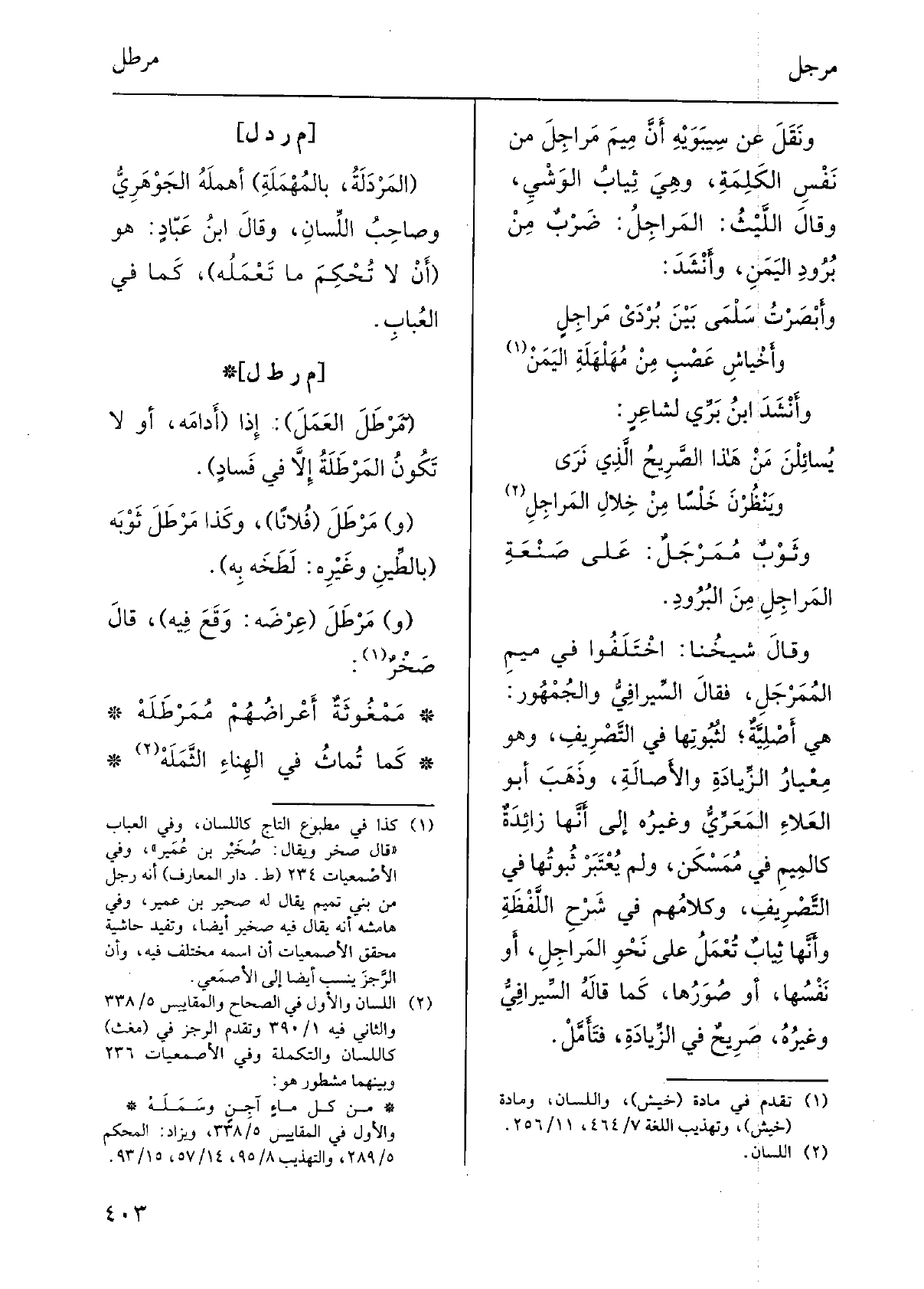 وَنَقَلَ عَن سِيبَوَيْهٍ أنّ ميمَ مَراجِلَ من نفسِ الكلمةِ، وَهِي ثيابُ الوَشْيِ، وَقَالَ الليثُ: المَراجِل: ضَربٌ من بُرودِ الْيمن، وَأنْشد: