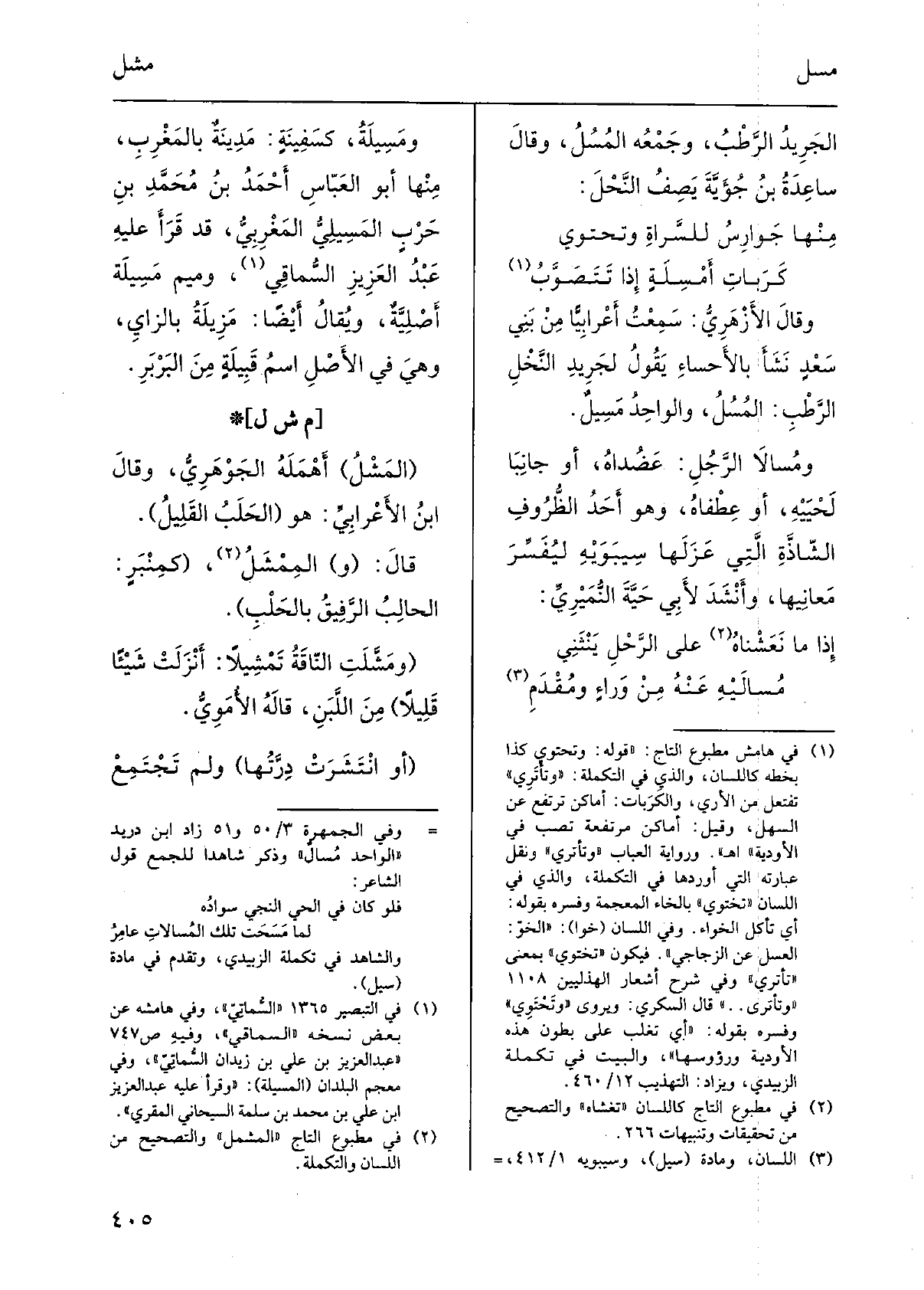 وَقَالَ الأَزْهَرِيّ: سَمِعْتُ أعرابِيّاً من بَني سَعدٍ نَشَأَ بالأَحْساءِ يقولُ لجَريدِ النَّخلِ الرَّطْب: المُسُل، والواحدُ مَسِيلٌ. ومُسالا الرجل: عَضُداه، أَو جانِبا لَحْيَيْه، أَو عِطْفاه، وَهُوَ أحدُ الظُّروفِ الشاذّةِ الَّتِي عَزَلَها سِيبَوَيْهٍ ليُفسِّرَ مَعَانِيهَا، وأنشدَ لأبي حَيَّةَ النُّمَيْريّ:
