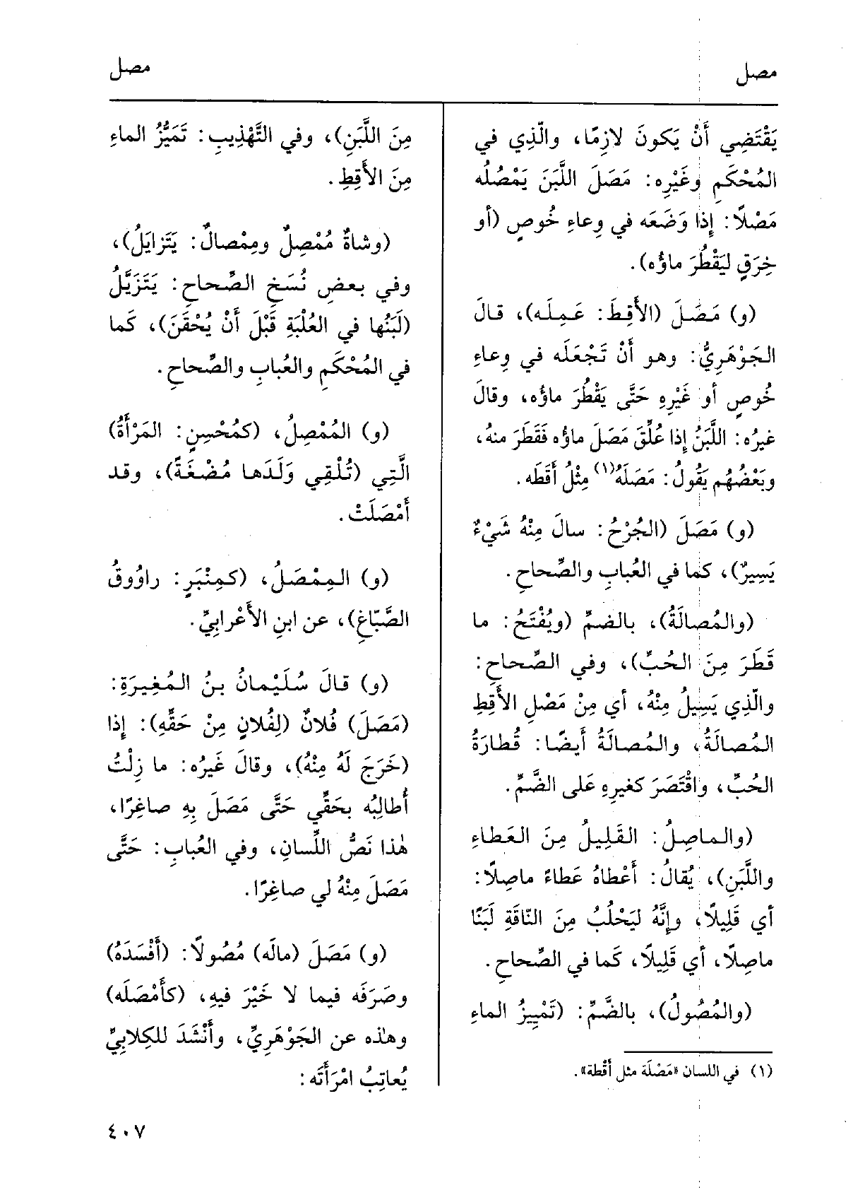 يَقْتَضِي أَن يكونَ لازِماً، وَالَّذِي فِي المحكَم وغيرِه: مَصَلَ اللَّبَنُ يَمْصُلُه مَصْلاً: إِذا وضعَه فِي وِعاءِ خُوصٍ، أَو خِرَقٍ لِيَقْطُرَ ماؤُه. مَصَلَ الأَقِطَ: عَمِلَه، قَالَ الجَوْهَرِيُّ: وَهُوَ أَنْ تجعلَهُ فِي وِعاءِ خُوصٍ أَو غيرِه حتّى يَقطُرَ ماؤُه، وَقَالَ غيرُه: اللَّبَنُ إِذا عُلِّقَ مَصَلَ ماؤُهُ فقطَرَ منهُ، وبعضُهم يَقُول: مَصَلَهُ مِثلُ أَقَطَه. مَصَلَ الجُرْحُ: سالَ منهُ شيءٌ يَسيرٌ، كَمَا فِي العبابِ والصِّحاحِ. والمُصالَةُ، بالضَّمِّ، ويُفتَحُ: مَا قَطَرَ من الحُبِّ، وَفِي الصحاحِ: وَالَّذِي يسيلُ مِنْهُ، أَي من مَصْلِ الأَقِطِ المُصالَةُ، والمُصالَةُ أَيضاً: قُطارَةُ الحُبِّ، واقتصَرَ كغيرِه على الضَّمِّ. والماصِلُ: القليلُ من العَطاءِ واللَّبَنِ، يُقال: أَعطاهُ عَطاء ماصِلاً، أَي قَلِيلا، وإنَّه لَيَحلُبُ من النّاقَةِ لَبَنًا ماصِلاً، أَي قَلِيلا، كَمَا فِي الصحاحِ. والمُصولُ، بالضَّمِّ: تَمييزُ الماءِ من اللَّبَنِ، وَفِي التهذيبِ تَمَيُّزُ الماءِ من الأَقِطِ. وشاةٌ مُمْصِلٌ ومِمْصالٌ: يَتَزايَلُ، وَفِي بعض نُسَخِ الصِّحاح: يَتَزَيَّلُ لَبَنُها فِي العُلبَةِ قبلَ أَنْ يُحْقَنَ، كَمَا فِي الْمُحكم والعباب والصِّحاحِ. المُمْصِلُ، كمُحْسِنٍ: المرأَةُ الَّتِي تُلقي ولدَها مُضْغَةً، قد أَمْصَلَتْ. المِمْصَلُ، كمِنبَرٍ: راووقُ الصَّبّاغِ، عَن ابْن الأَعْرابِيِّ. قَالَ سليمانُ بنُ المُغيرَةِ: مَصَلَ فلانٌ لِفُلانٍ من حَقِّهِ: إِذا خرجَ لهُ منهُ، وَقَالَ غيرُه: مَا زِلْتُ أُطالِبُه بحَقِّي حتّى مَصَلَ بِهِ صاغراً، هَذَا نَصُّ اللِّسانِ، وَفِي العبابِ: حتّى مصَلَ منهُ لي صاغِراً. مصَلَ مالَهُ مُصولاً: أَفسَدَهُ، وصرَفَهُ فِيمَا لَا خيرَ فِيهِ، كأَمْصَلَهُ، وَهَذِه عَن الجَوْهَرِيِّ، وأَنشدَ للكِلابِيِّ يُعاتِبُ امرأَتَه: