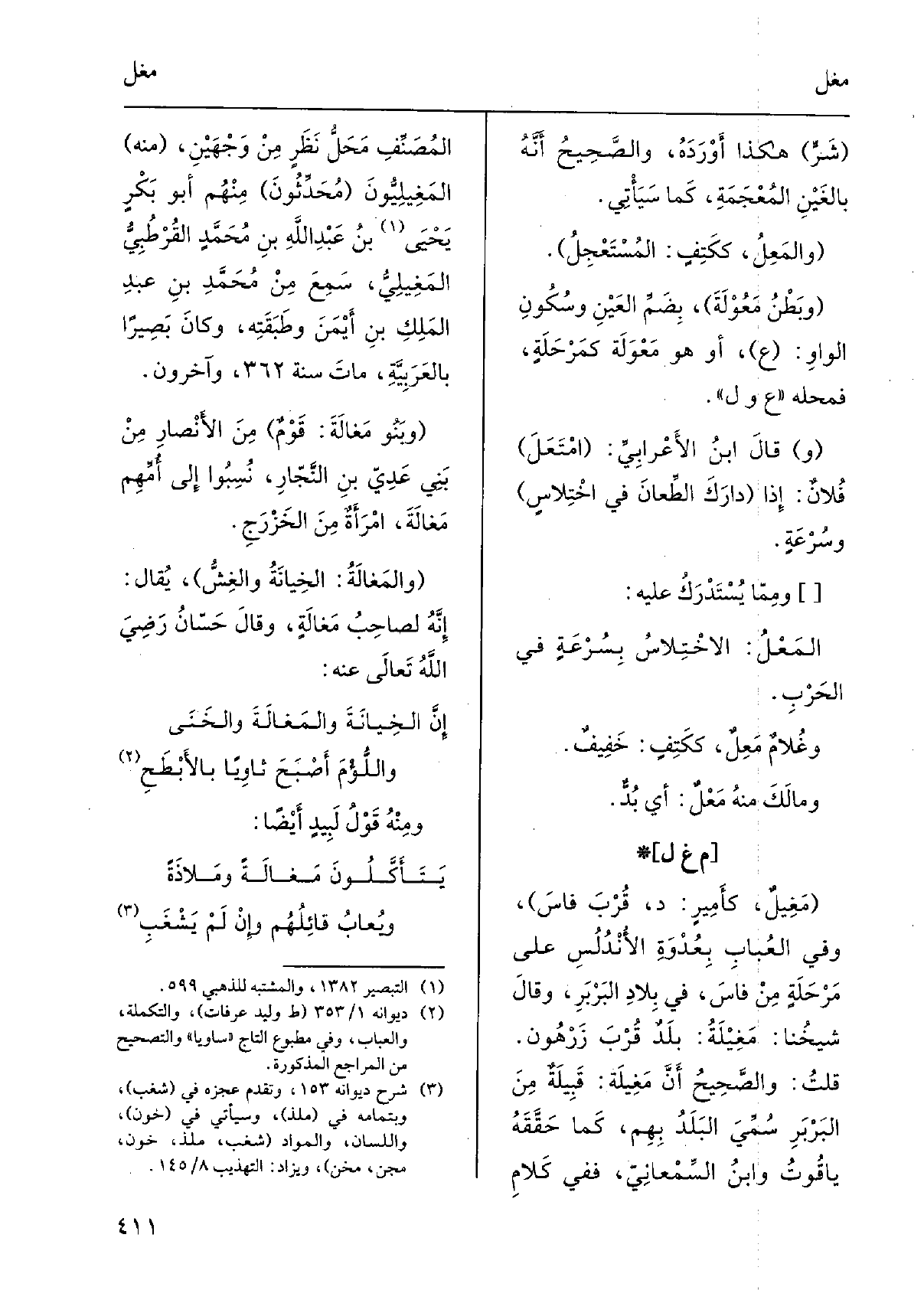 مَغِيلٌ، كأَميرٍ: د، قُرْبَ فاسَ، وَفِي العُبابِ بعُدْوَةِ الأَندَلُسِ على مرحَلةٍ من فاسَ، فِي بلادِ البَربَرِ، وَقَالَ شيخُنا: مَغيلَةُ: بلَدٌ قربَ زَرْهون. قلتُ: والصحيحُ أَنَّ مَغيلَةَ: قبيلَةٌ من البربر سُمِّيَ البلَدُ بهم، كَمَا حقَّقَهُ ياقوتُ وابنُ السَّمعانِيِّ، فَفِي كلامِ المصَنِّفِ مَحَلُّ نظَرٍ من وَجهَينِ، مِنْهُ المَغِيلِيُّونَ، مُحَدِّثونَ، مِنْهُم أَبو بكرٍ يَحيى بنُ عبد الله بنُ محمَّدٍ القُرْطُبِيُّ المَغيلِيُّ، سمِعَ من محمَّد بنِ عبد الملكِ بنِ أَيمنَ وطبقَتِه، وكانَ بَصيرًا بالعربيَّةِ، مَاتَ سنة، وَآخَرُونَ. وبَنو مَغالَةَ: قومٌ من الأَنصارِ من بني عدِيّ بنِ النَّجّارِ، نُسِبُوا إِلَى أُمِّهِم مَغالَةَ، امرأَةٌ من الخزرَجِ.