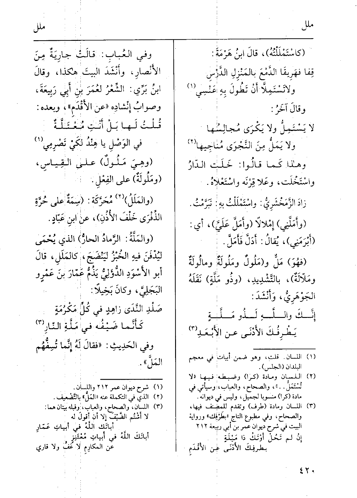 الأُذُنِ، عَن ابْن عَبّادٍ.} والمَلَّةُ: الرّمادُ الحارُّ الَّذِي يُحمَى لِيُدْفَنَ فِيهِ الخُبزُ ليَنْضَجَ، {كالمَلَلِ، قَالَ أَبو الأَسود الدُّؤَلِيُّ يَذُمُّ عَمّارَ بنِ عَمْروٍ البَجَلِيَّ، وَكَانَ بَخِيلًا:
