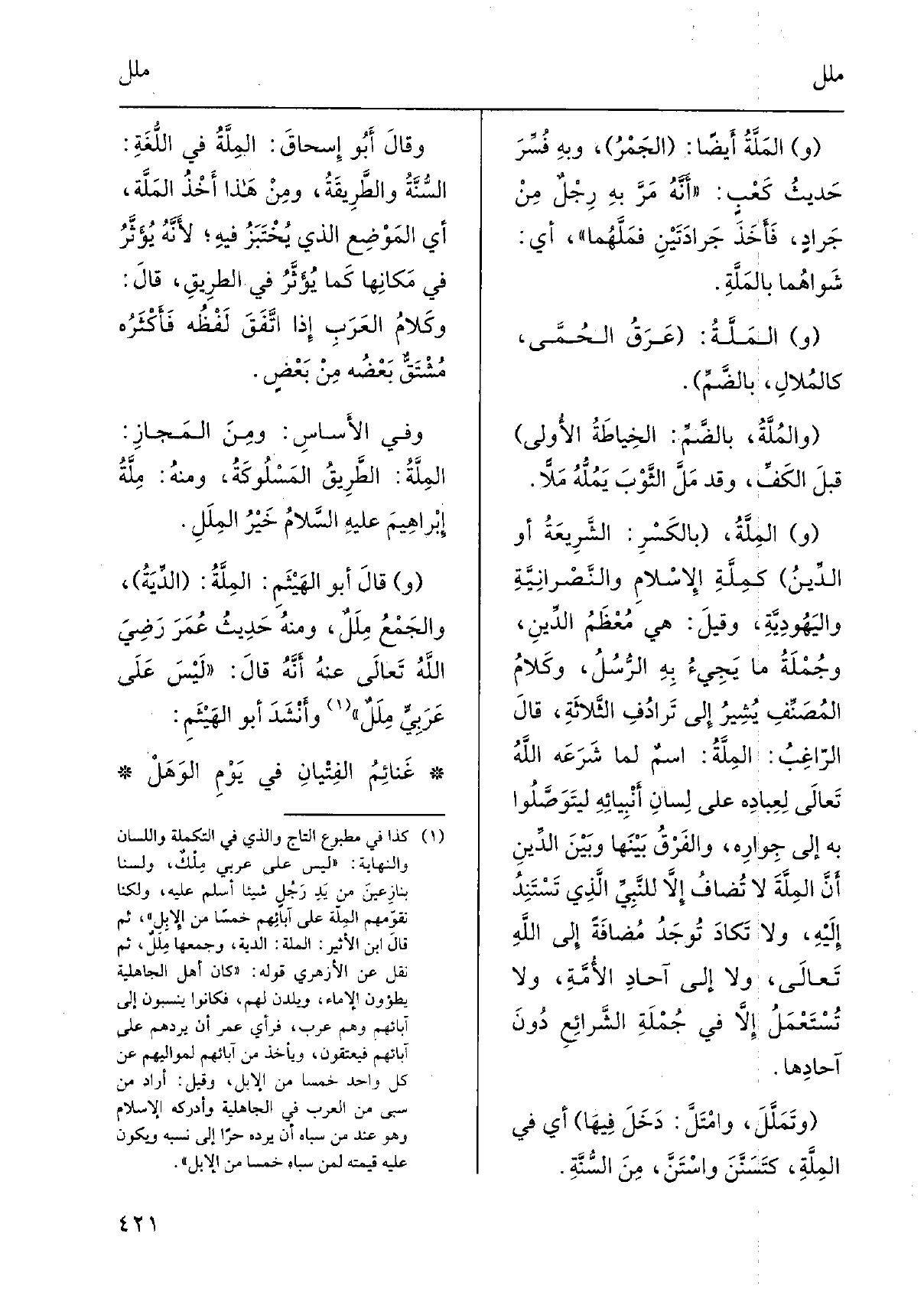 (و) {المَلَّةُ أَيضاً: الجَمْرُ، وَبِه فُسِّرَ حديثُ كَعْبٍ: أَنَّه مَرَّ بِهِ رِجْلٌ من جَرادٍ، فأَخَذَ جرادَتينِ} فمَلَّهُما، أَي شَواهُما {بالمَلَّةِ. المَلَّةُ: عَرَقُ الحُمَّى،} كالمُلالِ، بالضَّمِّ. {والمُلَّةُ، بالضَّمِّ: الخِياطَةُ الأُولَى، قبلَ الكَفِّ، وَقد} مَلَّ الثَّوبَ يَمُلُّهُ مَلاًّ. (و) {المِلَّةُ، بالكسْرِ: الشريعَةُ أَو الدِّينُ،} كمِلَّةِ الإسلامِ والنَّصرانِيَّةِ واليَهودِيَّةِ، وَقيل: هِيَ مُعظَمُ الدِّينِ، وجُملَةُ مَا يجيءُ بِهِ الرُّسُلُ، وكلامُ المُصنِّفِ يَشيرُ إِلَى تَرادُفِ الثّلاثَةِ، قَالَ الرّاغِبُ: المِلَّةُ: اسْمٌ لِما شرعَهُ الله تَعَالَى لعِبادِه على لِسانِ أَنبِيائه لِيَتَوَصَّلوا بِهِ إِلَى جِوارِه، والفرقُ بينَها وبينَ الدِّينِ إنَّ المِلَّةَ لَا تُضافُ إلاّ للنَّبِيِّ الَّذِي تستنِدُ إِلَيْهِ، وَلَا تكادُ توجَدُ مُضافَةً إلاّ إِلَى الله تَعَالَى، وَلَا إِلَى آحادِ الأُمَّةِ، وَلَا تَستعمَلُ إلاّ فِي جُملَةِ الشَّرائعِ دونَ آحادِها. {وتَمَلَّلَ،} وامْتَلَّ: دخَلَ فِيهَا، أَي فِي المِلَّةِ، كتَسَنَّنَ واسْتَنَّ، من السُنَّةِ. وَقَالَ أَبو إسحاقَ: المِلَّةُ فِي اللُّغَةِ: السُّنَّةُ والطَّريقَةُ، وَمن هَذَا أَخْذُ المَلَّة، أَي الْموضع الَّذِي يُخْتَبَزُ فِيهِ، لأَنَّهُ يُؤَثَّرُ فِي مَكانِها كَمَا يؤَثَّرُ فِي الطَّريقِ، قالَ: وكلامُ العَرَبِ إِذا تَّفَقَ لفظُه فأَكثَرُهُ مُشْتَقٌّ من بعضٍ. وَفِي الأَساس: ومنَ المَجاز: المِلَّةُ: الطّريقُ المَسلوكَةُ، وَمِنْه: {مِلَّةُ إبراهيمَ عَلَيْهِ السّلامُ خَيْرُ المِلَلِ. قَالَ أَبو الهَيثَم: المِلَّةُ: الدِّيَةُ، والجَمْعُ} مِلَلٌ، وَمِنْه حَدِيث عمرَ رَضِي الله تَعَالَى عَنهُ أَنَّه قَالَ: ليسَ على عربِيٍّ مِلَلٌ. وأَنشدَ أَبو الهَيثَمِ: غَنائمُ الفِتيانِ فِي يَوْمِ الوَهَلْ