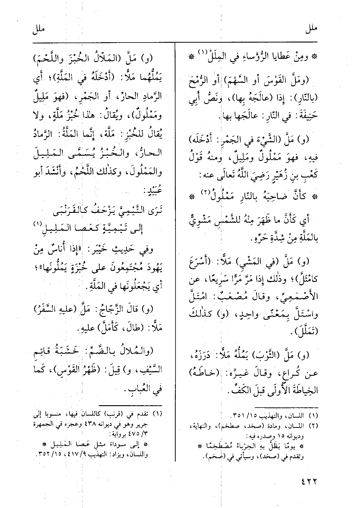 ومِنْ عَطايا الرُّؤساءِ فِي {المِلَلْ} ومَلَّ القوسَ أَو السَّهْمَ أَو الرُّمْحَ بالنّارِ: إِذا عالجَهُ بهَا، ونَصُّ أَبي حنيفَةَ: فِي النَّارِ: عالَجَها بهَا. مَلَّ الشيءَ فِي الجَمْرِ: أَدْخَلَهُ فِيهِ، فهم {مَمْلولٌ} ومَليلٌ، وَمِنْه قولُ كعبِ بنِ زُهَيْرٍ رَضِي الله تَعَالَى عَنهُ: كأَنَّ ضاحِيَهُ بالنَّارِ مَمْلولُ أَي كأَنَّ مَا ظهَرَ مِنْهُ للشَّمْسِ مَشْوِيٌّ {بالمَلَّةِ من شِدَّةِ حَرِّهِ. مَلَّ فِي المَشْيِ} مَلاًّ: أَسرَعَ {كامْتَلَّ، وذلكَ إِذا مَرَّ مَرّاً سَرِيعا، عَن الأَصمَعِيِّ، وَقَالَ مُصعَبٌ:} امْتَلَّ واسْتَلَّ بِمَعْنى واحدٍ، كذلكَ {تَمَلَّلَ. مَلَّ الثَّوْبَ} يَمُلُّهُ مَلاًّ: درَزَهُ، عَن كُراعٍ، وَقَالَ غيرُه: خاطَهُ، الخِياطَةُ الأَولى قبلَ الكَفِّ. مَلَّ)