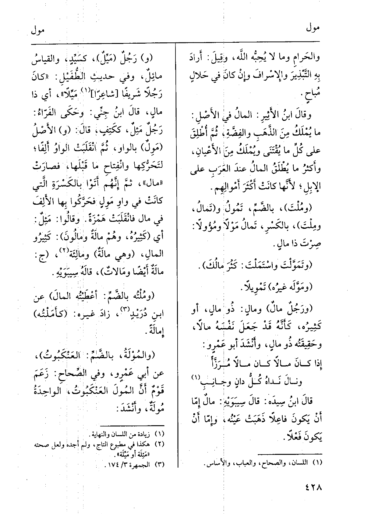 والحرامِ وَمَا لَا يُحِبُّه الله، وقيلَ: أَرادَ بِهِ التَّبذيرَ والإسرافَ وَإِن كانَ فِي حَلالٍ مُباحٍ. وَقَالَ ابنُ الأَثيرِ: المالُ فِي الأَصْلِ: مَا يُمْلَكُ من الذَّهَبِ والفِضَّةِ، ثمَّ أُطْلِقَ على كُلِّ مَا يُقْتَنى ويُمْلَكُ من الأَعيانِ، وأَكثَرُ مَا يُطلَقُ المالُ عندَ العربِ على الإبِلِ، لأَنَّها كَانَت أَكثَرَ {أَموالِهِمْ.} ومُلْتَ، بالضَّمِّ، {تَمُولُ} وتَمالُ، {ومِلْتَ، بالكَسرِ،} تَمالُ {مَوْلاً} ومُؤُولاً: صِرْتَ ذَا مالٍ. {وتَمَوَّلْتَ} واسْتَمَلْتَ: كَثُرَ {مالُكَ.} ومَوَّلَهُ غيرُه تَمويلاً. ورَجُلٌ {مالٌ ومالٍ: ذُو مالٍ، أَو كثيرُه، كأَنَّه قد جعلَ نفسَه مَالا، وحقيقتُه ذُو مالٍ، وأَنشدَ أَبو عَمروٍ: