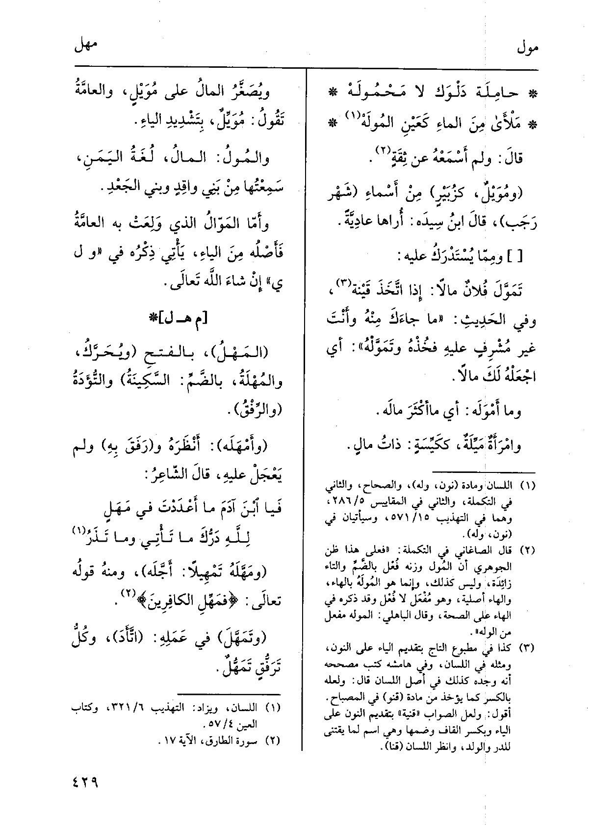 ومِمّا يُستدرَكُ عَلَيْهِ: {تَمَوَّلَ فلانٌ} مَالا: إِذا اتَّخَذَ قَيْنَةً، وَفِي الحديثِ: مَا جاءَكَ منهُ وأَنتَ غير مُشرِفٍ عَلَيْهِ فخُذْهُ {وتَمَوَّلْهُ أَي اجْعَلْهُ لكَ مَالا. وَمَا} أَمْوَلَهُ: أَي مَا أَكثرَ {مالَه. وامرأَةٌ} مَيِّلَةٌ، ككَيِّسَةٍ: ذاتُ مالٍ. ويُصَغَّرُ المالُ على {مُوَيْلٍ، والعامَّةُ تَقول:} مُوَيِّلٌ، بتَشْديد الياءِ.! والمُولُ: المالُ، لغةُ اليَمَنِ، سمعتُها من بني واقِدٍ وبَني الجَعْدِ. وأَمّا المَوّالُ الَّذِي وَلِعَتْ بِهِ العامَّةُ فأصلُه من الياءِ، يأْتي ذِكْرُهُ فِي ولي إنْ شاءَ الله تَعَالَى.
