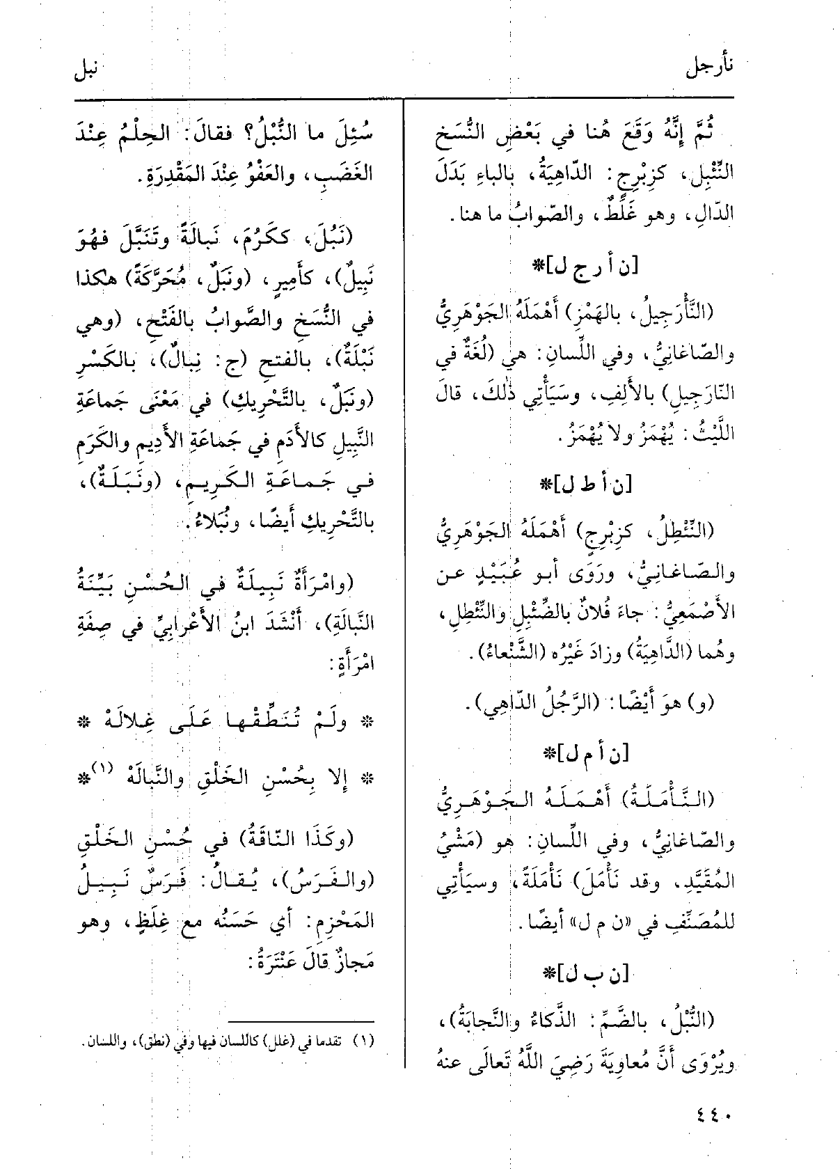 النُّبْلُ، بالضَّمِّ: الذَّكاءُ والنَّجابَةُ، ويروى أَنَّ مُعاوِيَةَ رَضِي الله تَعَالَى عَنهُ سئلَ مَا النُّبْلُ فَقَالَ: الحِلْمُ عندَ الغَضَبِ، والعَفْوُ عندَ المَقْدِرَةِ. نَبُلَ، ككَرُمَ، نَبالَةً وتَنَبَّلَ فَهُوَ نَبيلٌ، كأَميرٍِ، ونَبَلٌ، محرَّكَةً، هَكَذَا فِي النُّسَخِ والصَّوابُ بالفتحِ، وَهِي نَبلَةٌ، بِالْفَتْح، ج: نِبالٌ، بالكَسرِ، ونَبَلٌ، بالتَّحريكِ، فِي معنى جماعَةِ النَّبيلِ كالأَدَم فِي جمَاعَة الأَديمِ والكَرَمِ فِي جماعَةِ الكَريمِ، ونَبَلَةٌ، بالتَّحريكِ أَيضاً، ونُبلاءُ. وامْرأَةٌ نبيلَةٌ فِي الحُسْنِ بَيِّنَةُ النَّبالَةِ، أَنشدَ ابْن الأَعْرابِيّ فِي صفَةِ امرأَةٍ: ولَمْ تُنَطِّقْها على غِلالَهْ إلاّ بحُسْنِ الخَلْقِ والنَّبالَهْ وَكَذَا النّاقَةُ فِي حُسنِ الخَلْقِ، والفَرَسُ، يُقال: فرَسٌ نبيلُ المَحزِمِ: أَي حسَنُهُ معَ غِلَظٍ، وَهُوَ مَجازٌ، قَالَ عنترَةُ: