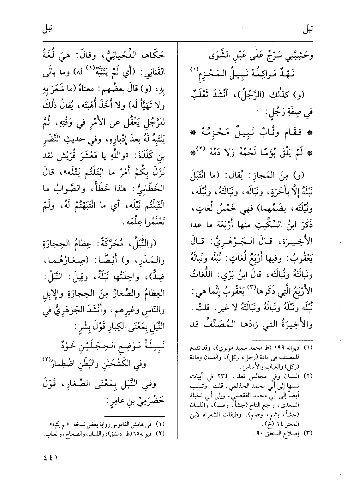 كذلكَ الرَّجُلُ، أَنشدَ ثعلَبٌ فِي صفَةِ رجُلٍ: فقامَ وَثَّابٌ نَبيلٌ مَحْزِمُهْ لمْ يلْقَ بُؤْساً لحمُهُ وَلَا دَمُهْ منَ المَجاز: يُقالُ: مَا انْتَبَلَ نَبْلَهُ إلاّ بأَخَرَةٍ، ونَبالَه، ونَبالَتَهُ، ونُبْلَهُ، ونُبْلَتَه، بضَمِّهما، فهِيَ خَمسُ لُغاتٍ، ذكرَ ابْن السِّكِّيت مِنْهَا أَربعة مَا عدا الأَخيرَة، قَالَ الجَوْهَرِيُّ: قَالَ يعقوبُ: وفيهَا أَربعُ لُغاتٍ: نُبْلَه ونَبالَهُ ونَبالَتَهُ ونُبالَتَه، قَالَ ابْن برّيّ: اللُّغاتُ الأَربَعُ الَّتِي ذكرَها يعقوبُ إنَّما هِيَ: نُبلَهُ ونَبْلَهُ ونَبالَهُ ونبالَتَهُ لَا غير. قلتُ: والأَخيرةُ الَّتِي زادَها المَصنِّفُ قد حَكَاهَا اللِّحيانِيُّ، وَقَالَ: وَهِي لغَةُ القَنانِي: أَي لَمْ يتَنَبَّهْ لَهُ، وَمَا بالَى بهِ، قَالَ بعضُهُم: معناهُ مَا شعرَ بِهِ وَلَا تَهَيّأَ لَهُ، وَلَا أَخَذَ أُهْبَتَهُ، يُقَال ذَلِك للرَّجُلِ يغفُلُ عَن الأَمر فِي وقتِهِ، ثمَّ ينتبِهُ لهُ بعدَ إدْبارِهِ، وَفِي حديثِ النَّضْرِ بنِ كَلَدَةَ: واللهِ يَا معشَر قريشٍ لقد نزلَ بكم أَمرٌ مَا ابْتَلْتُمْ بَتْلَه. قَالَ الخَطّابيُّ: هَذَا خَطأٌ، والصّوابُ مَا انْتَبَلْتُمْ نَبْلَه، أَي مَا انْتَبَهْتَم لَهُ، ولمْ تعلَموا عِلْمَه. والنَّبَلُ، محرَّكَةً: عِظامُ الحِجارَةِ والمَدَرِ، أَيضاً: صِغارُهُما، ضِدٌّ، واحدَتُها نَبَلَةٌ، وقيلَ: النَّبَلُ: العِظامُ والصِّغارُ من الحِجارَةِ والإبِلِ والنّاسِ وغيرِهم، وأَنشدَ الجَوْهَرِيّ فِي النَّبَلِ بِمَعْنى الكِبارِ قولَ بِشْرٍ:)