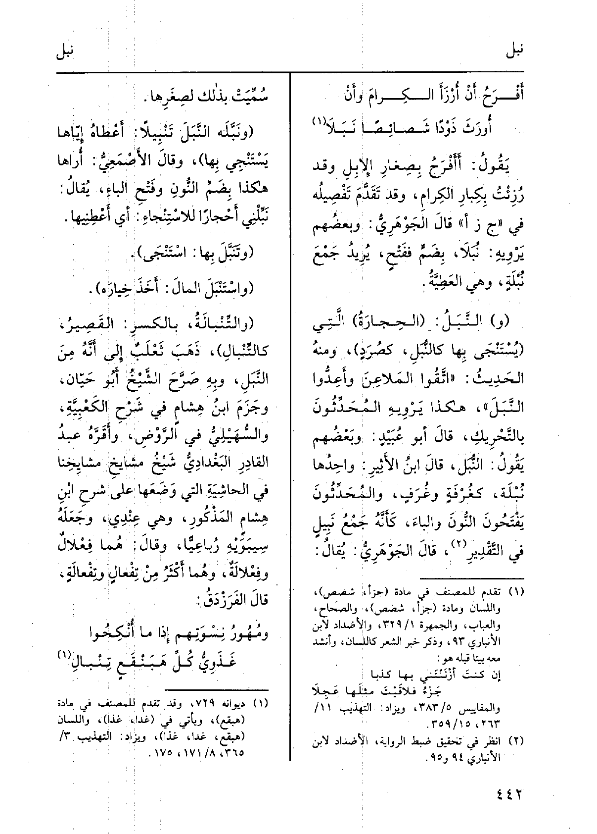 يَقُول: أَأَفْرَحُ بصِغارِ الإِبِلِ وَقد رُزِئْتُ بكِبارِ الكِرامِ، وَقد تقدَّمَ تفصيلُه فِي جزأ، قَالَ الجَوْهَرِيُّ: وبعضُهم يَرويه: نُبَلاً، بضَمٍّ ففَتْحٍ، يريدُ جَمعَ نُبْلَةٍ، وَهِي العَطِيَّةُ. النَّبَلُ: الحِجارَةُ الَّتِي يُستَنْجَى بهَا كالنُّبَلِ، كصُرَدٍ، وَمِنْه الحديثُ: اتَّقوا المَلاعِنَ وأَعِدُّوا النَّبَلَ، هَكَذَا يرويهِ المُحَدِّثونَ بالتَّحريكِ، قَالَ أَبو عُبيدٍ: وبعضُهُم يَقُول: النُّبَل، قَالَ ابنُ الأَثيرِ: واحِدها نُبلَة، كغُرْفَةٍ وغُرَفٍ، والمُحَدِّثونَ يفتحونَ النُّونَ والباءَ، كأَنَّه جَمعُ نَبيلٍ فِي التَّقديرِ، قَالَ الجَوْهَرِيُّ: يُقال: سُمِّيَتْ بذلكَ لِصِغَرِها. ونَبَّلَهُ النَّبَلَ تَنْبيلاً: أَعطاهُ إيّاها يستَنجي بهَا، وَقَالَ الأَصمعيُّ: أُراها هَكَذَا بضَمِّ النُونِ وَفتح الباءِ، يُقالُ: نَبِّلْني أَحْجارأً للاسْتِنْجاءِ: أَي أَعطِنيها. وتَنَبَّلَ بهَا: اسْتَنْجى.
